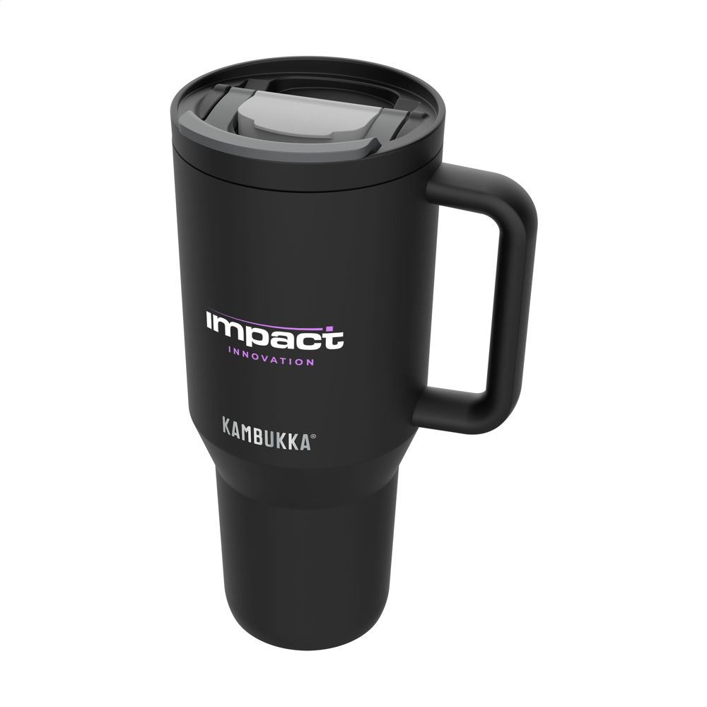 Large, vacuum insulated 18/8 stainless steel tumbler made by Kambukka® • plastic lid with telescopic straw with cover and lockable drinking opening • keeps cold drinks such as water, smoothies, milkshakes and other beverages cool for up to 24 hours • excellent quality • BPA-free • generously sized, plastic handle • suitable for left- and right-handed use • non-slip base • fits most cup holders • 100% leak proof (in closed position) • the cup is dishwasher-safe - washing by hand is recommended to preserve the imprint • the lid and removable parts are not dishwasher-safe • capacity 950 ml. STOCK AVAILABILITY: Up to 1000 pcs accessible within 6 days plus standard lead-time. Subject to availability.
