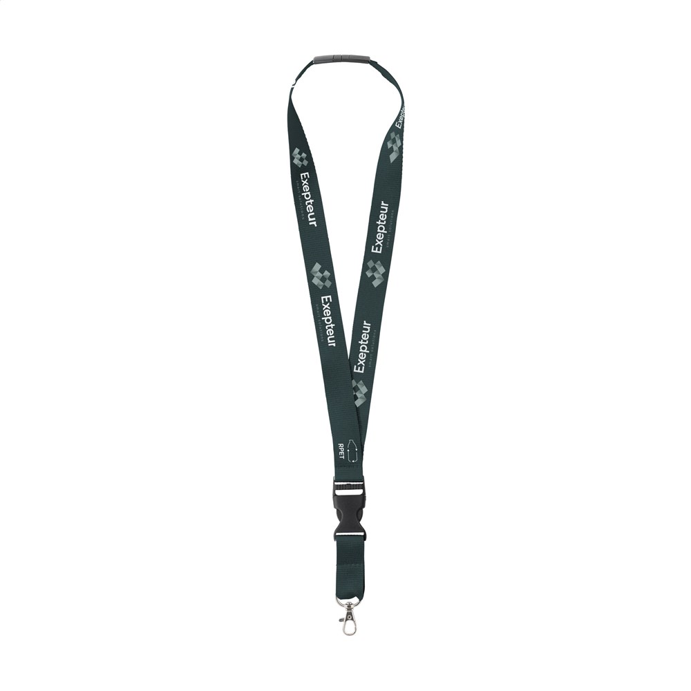 Lanyard of strong woven RPET polyester. With metal carabiner and plastic safety lock. The lower part can be disconnected by means of a plastic buckle. Including full-colour sublimation print. Made in Europe.