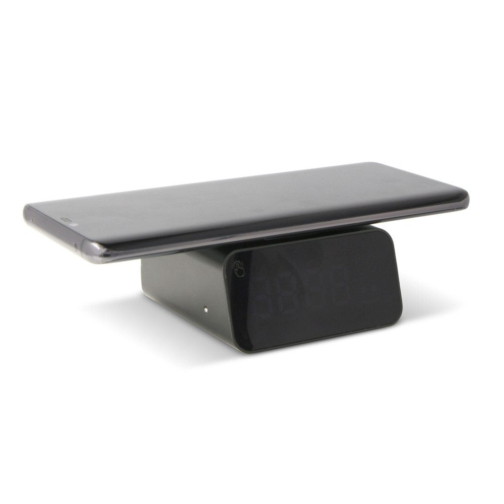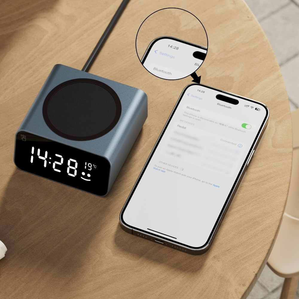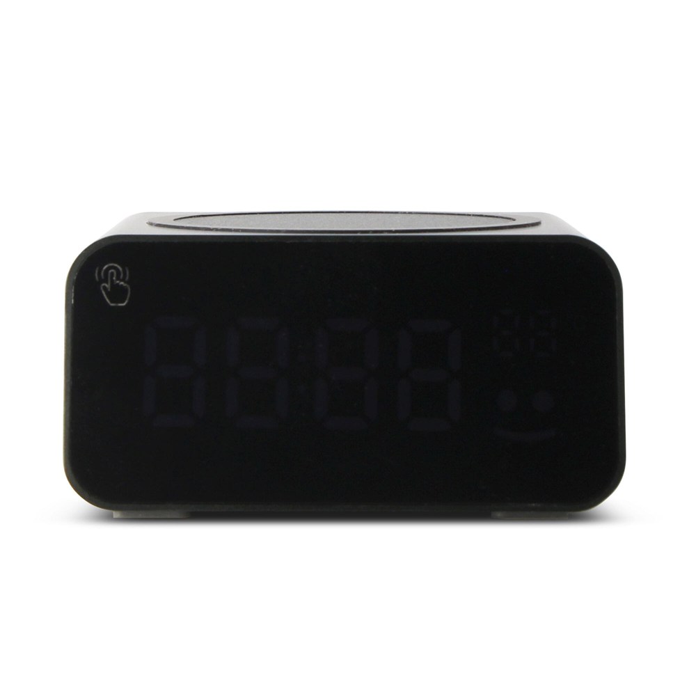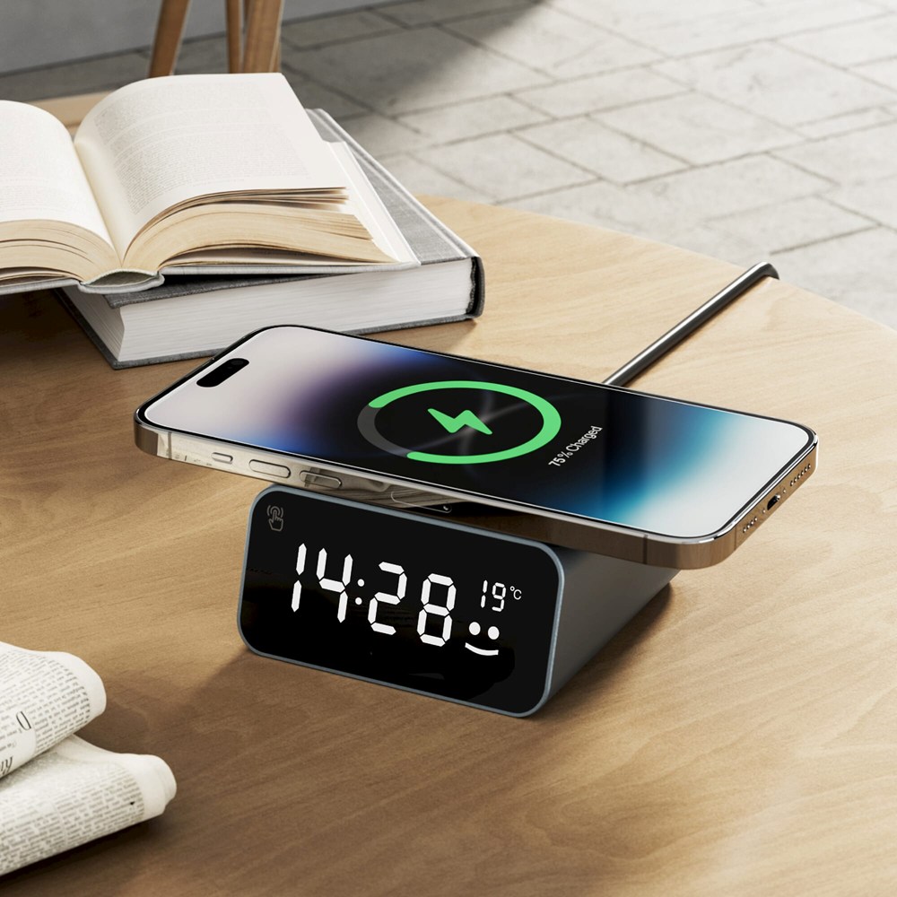 Experience innovation! Our clock with wireless charger, crafted from recycled aluminum, delivers fast 15W charging. The smiley face icon lights up during fast charging. With temperature monitoring, auto time setting, and an alarm feature, it's a game-changer in convenience and sustainability.