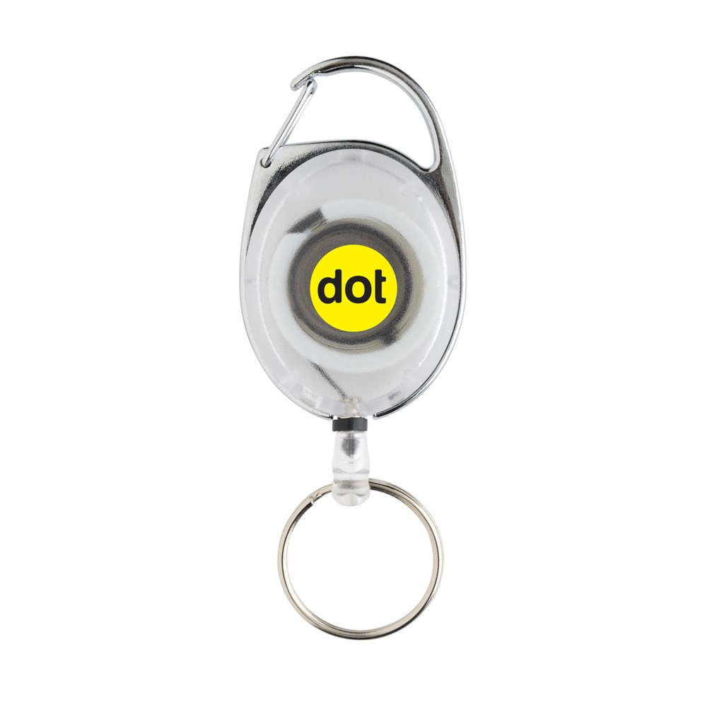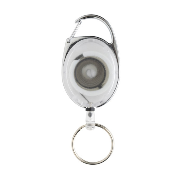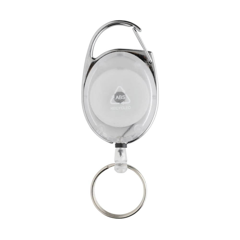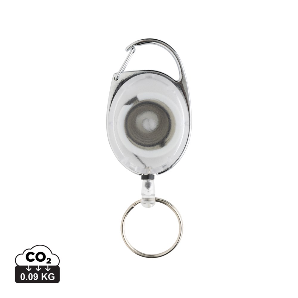 Roller clip keychain made with RCS recycled ABS and zinc alloy. Ideal item for office, trade show or even when skiing. With 60cm cord to attach badge for easy access. With carabiner hook to attach to bag or clothing. Total recycled content: 34% based on total item weight. RCS certification ensures a completely certified supply chain of the recycled materials. Packed in paper bag.