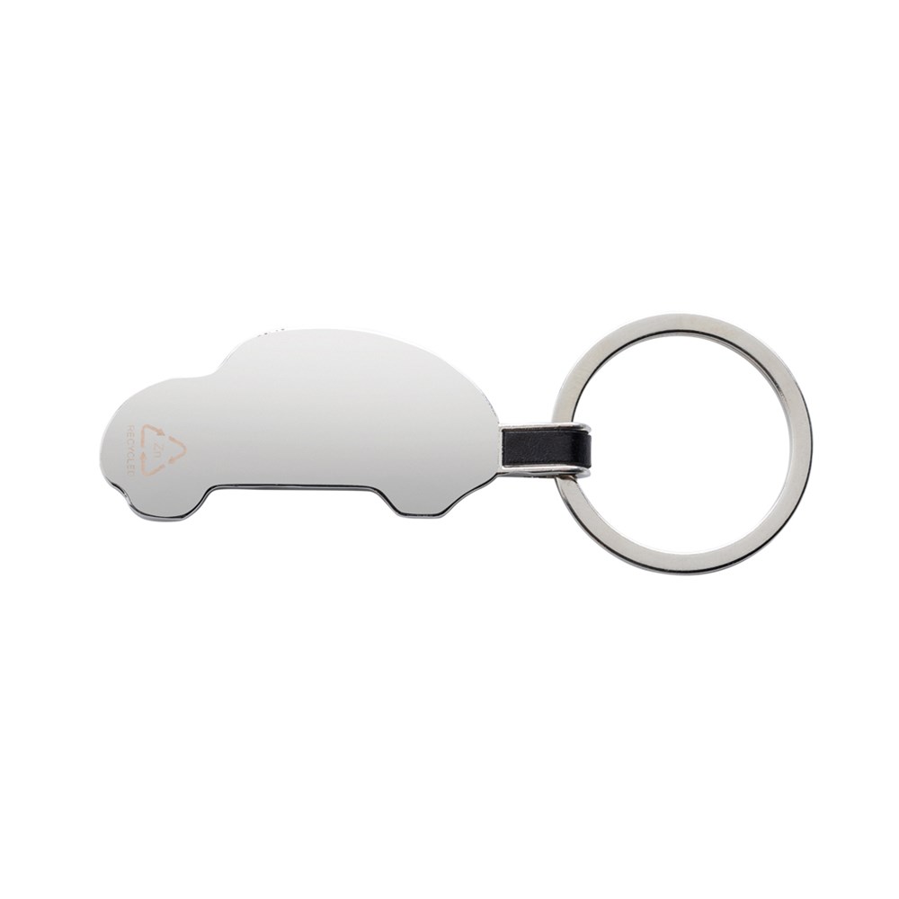 Car shaped keychain made from RCS recycled zinc alloy. Total recycled content: 84% based on total item weight. RCS certification ensures a completely certified supply chain of the recycled materials. Packed in paper bag.
