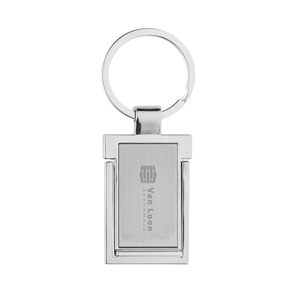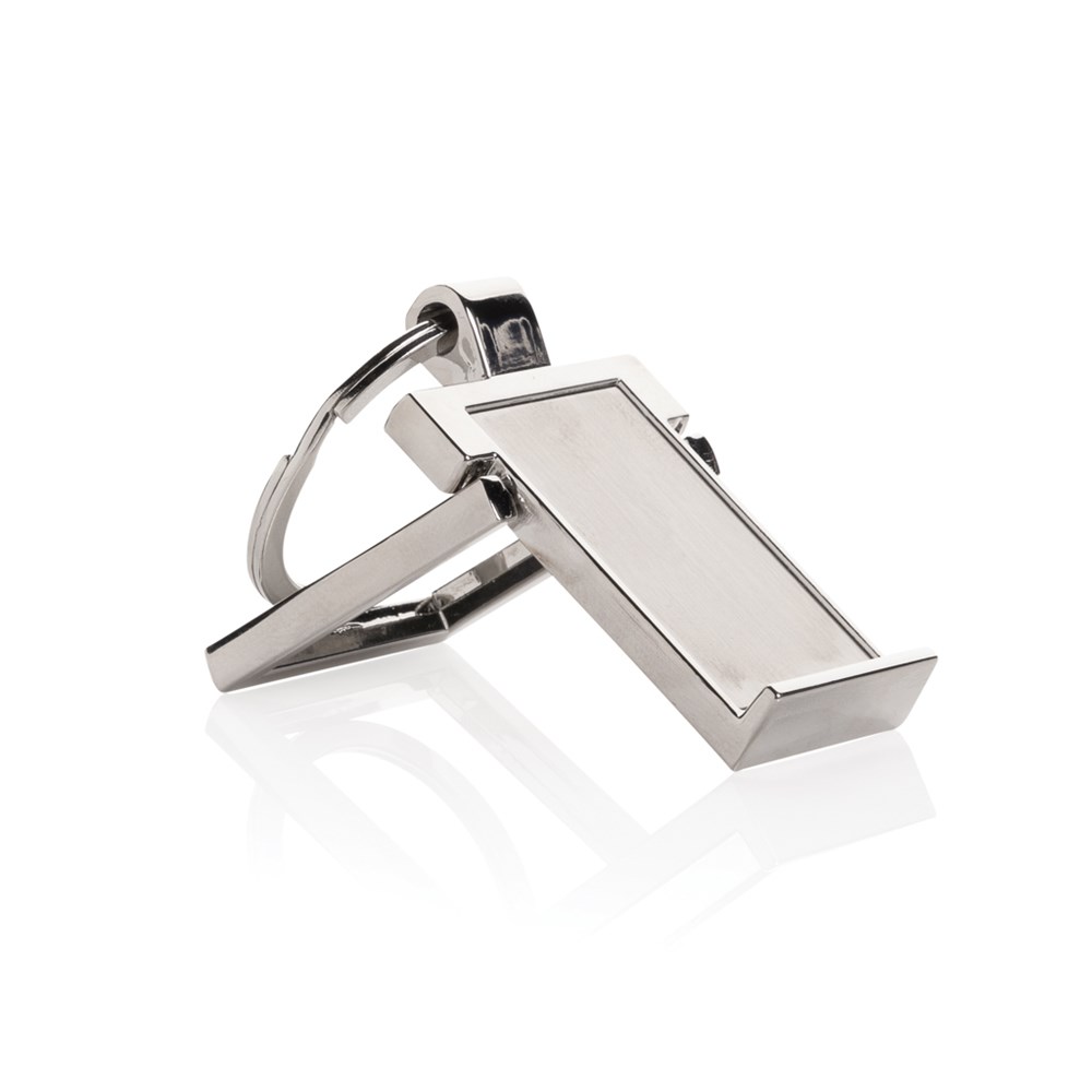 Luxury keychain with phone stand made with RCS recycled zinc alloy. Total recycled content: 86% based on total item weight. RCS certification ensures a completely certified supply chain of the recycled materials. Packed in paper bag.