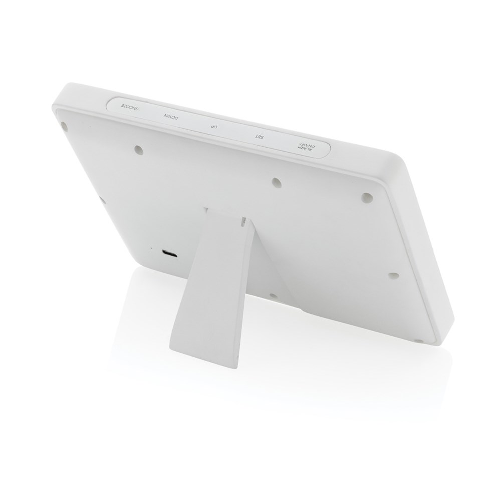 Large LED screen clock made with RCS (Recycled Claim Standard) certified recycled ABS and FSC® 100% bamboo. Total recycled content: 76 % based on total item weight. RCS certification ensures a completely certified supply chain of the recycled materials. With high quality LED screen. Functions: clock, alarm, snooze, temperature, 12/24 hour option. Including 100 cm type C charging cable made from RCS certified recycled TPE. Packed in FSC® mix kraft box.