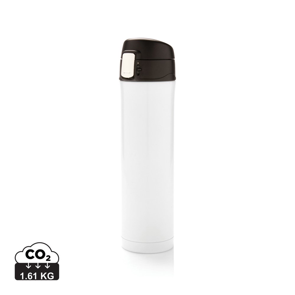 This great double wall stainless steel vacuum flask keeps your drink warm for up to 5 hours or cool for up to 15 hours. The lid is lockable and therefore avoids any risk of leaking or spilling. The lid is easy to keep clean for optimal hygiene and is dishwasher safe. The unique design of the flask allows you to drink conveniently and safely with one hand directly from the flask. The size of the flask is suitable to place in any car drink holder. Made with RCS (Recycled Claim Standard) certified recycled materials. RCS certification ensures a completely certified supply chain of the recycled materials. Total recycled content: 76% based on total item weight. BPA free. Capacity 450ml. Including FSC®-certified kraft packaging.