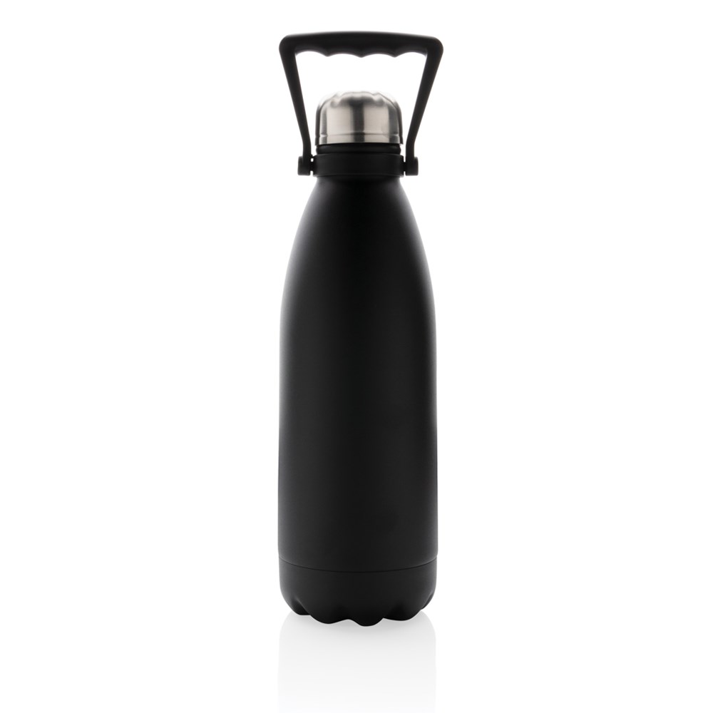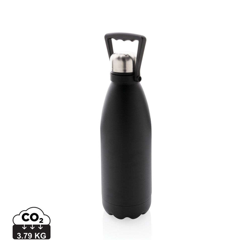 Take your favourite drinks everywhere in this large double wall stainless steel bottle. With its large capacity of 1.5 litres, you are assured to have plenty to drink and the bottle keeps your beverages hot for up to 5 hours or cold for up to 15 hours. The bottle has a beautiful powder coated finish and a convenient handle for easy carrying. Made with RCS (Recycled Claim Standard) certified recycled materials. RCS certification ensures a completely certified supply chain of the recycled materials. Total recycled content: 88% based on total item weight. Capacity 1500ml. BPA free. Including FSC®-certified kraft packaging.