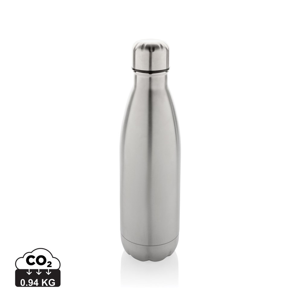 Elevate your daily water intake with this single wall stainless steel bottle. The bottle is suitable for cold drinks only. With a base that fits in most cup holders, this sleek looking water bottle will keep you hydrated on the go wherever you are. Made with RCS (Recycled Claim Standard) certified recycled materials. RCS certification ensures a completely certified supply chain of the recycled materials. Total recycled content: 84% based on total item weight. BPA free. Capacity 500ml. Including FSC®-certified kraft packaging.