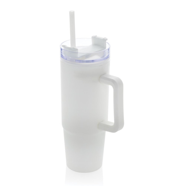 Introducing the Tana double wall plastic tumbler, a 750ml tumbler made from 42% recycled material for low impact hydration. Whether you're working, exercising, or travelling, this tumbler is your ideal companion. The advanced lid features a rotating cap with three positions: a spill-resistant straw opening, a sipping spout, and a fully sealed lid. The ergonomic handle with comfort-grip inserts ensures easy carrying and the slim base fits most car cup holders. Hand wash only. Total recycled content: 42% based on total item weight. BPA free. Capacity 750ml. Including FSC®-certified kraft gift packaging.