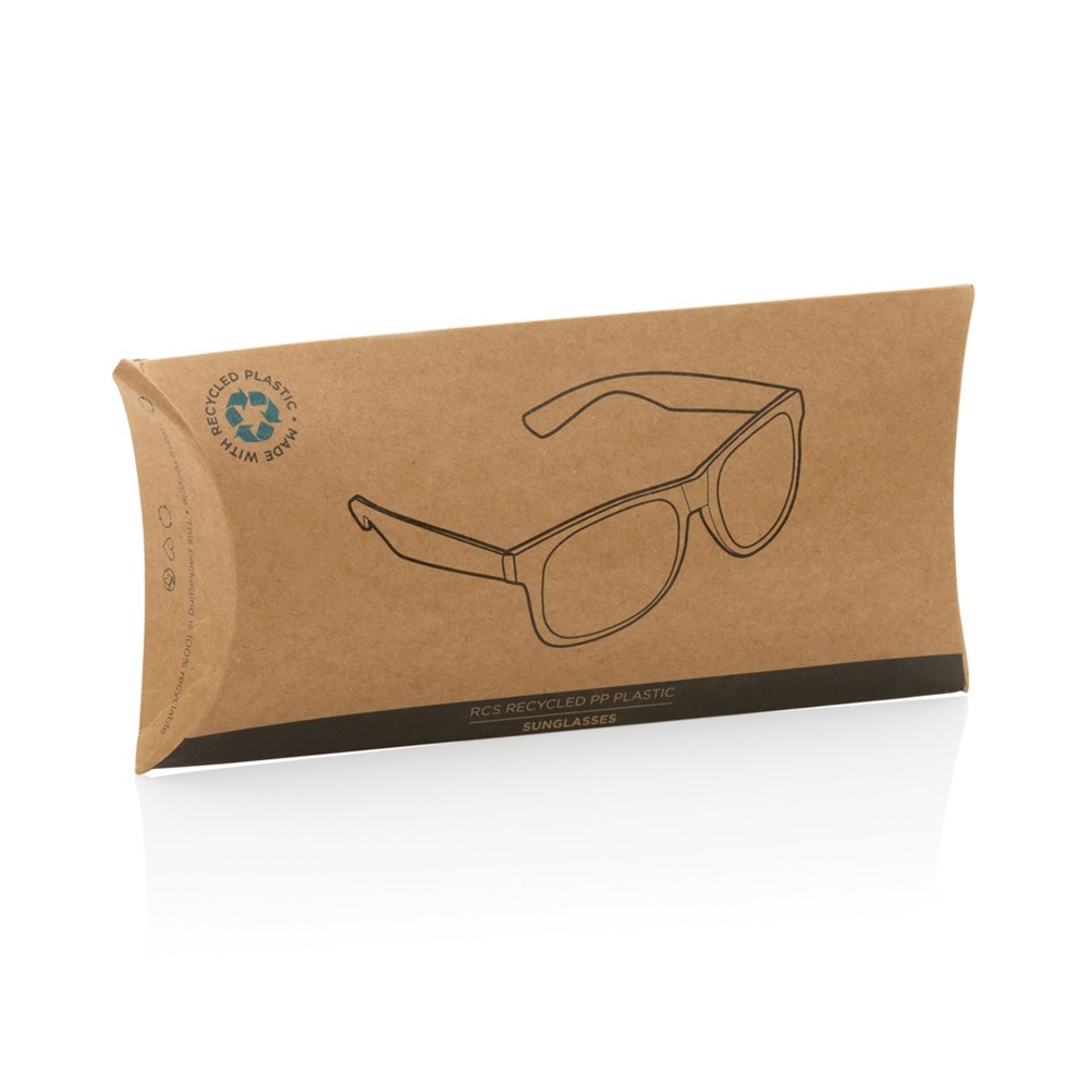 Sunglasses made with RCS certified recycled PP frame. Recycled content of frame is 100%. Total recycled content: 66% based on total item weight. RCS certification ensures a completely certified supply chain of the recycled materials. The lenses are smoky acrylic and conform to EN ISO 12312-1,UV 400 and CAT 3. Packed in an FSC® kraft sleeve.