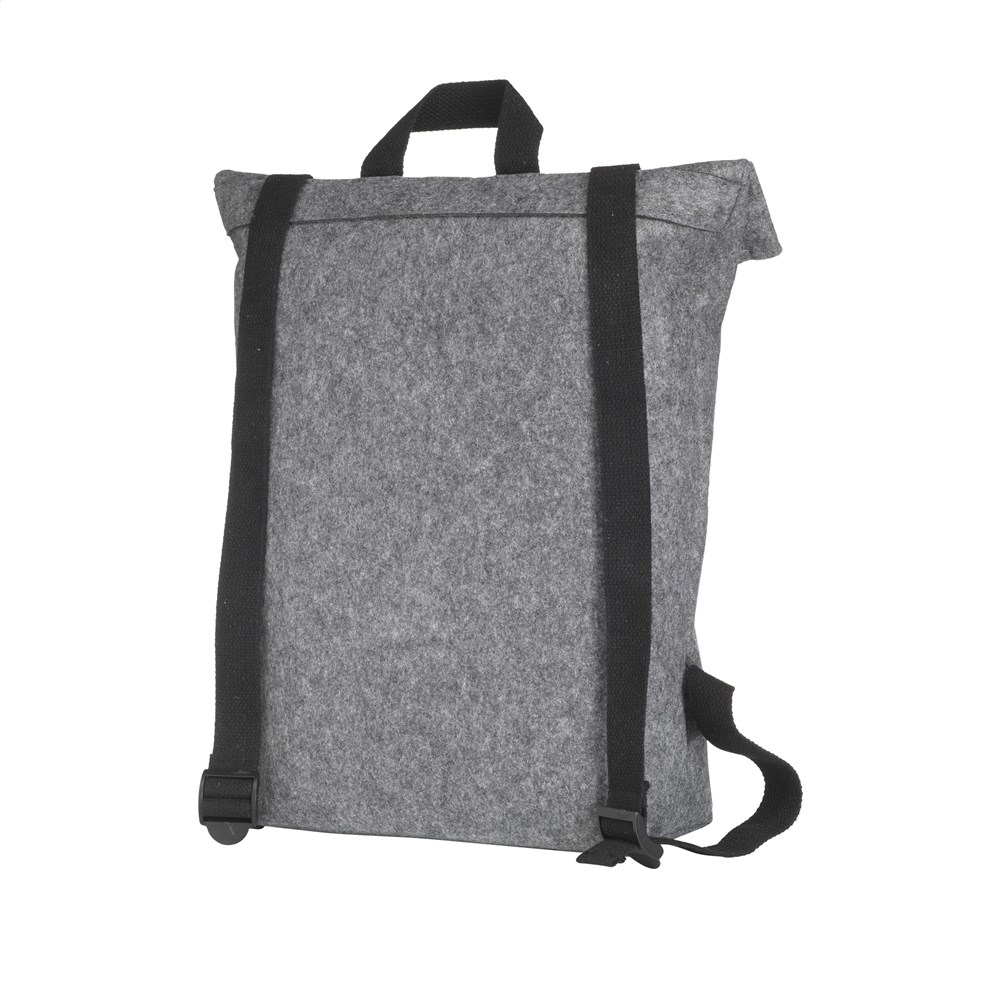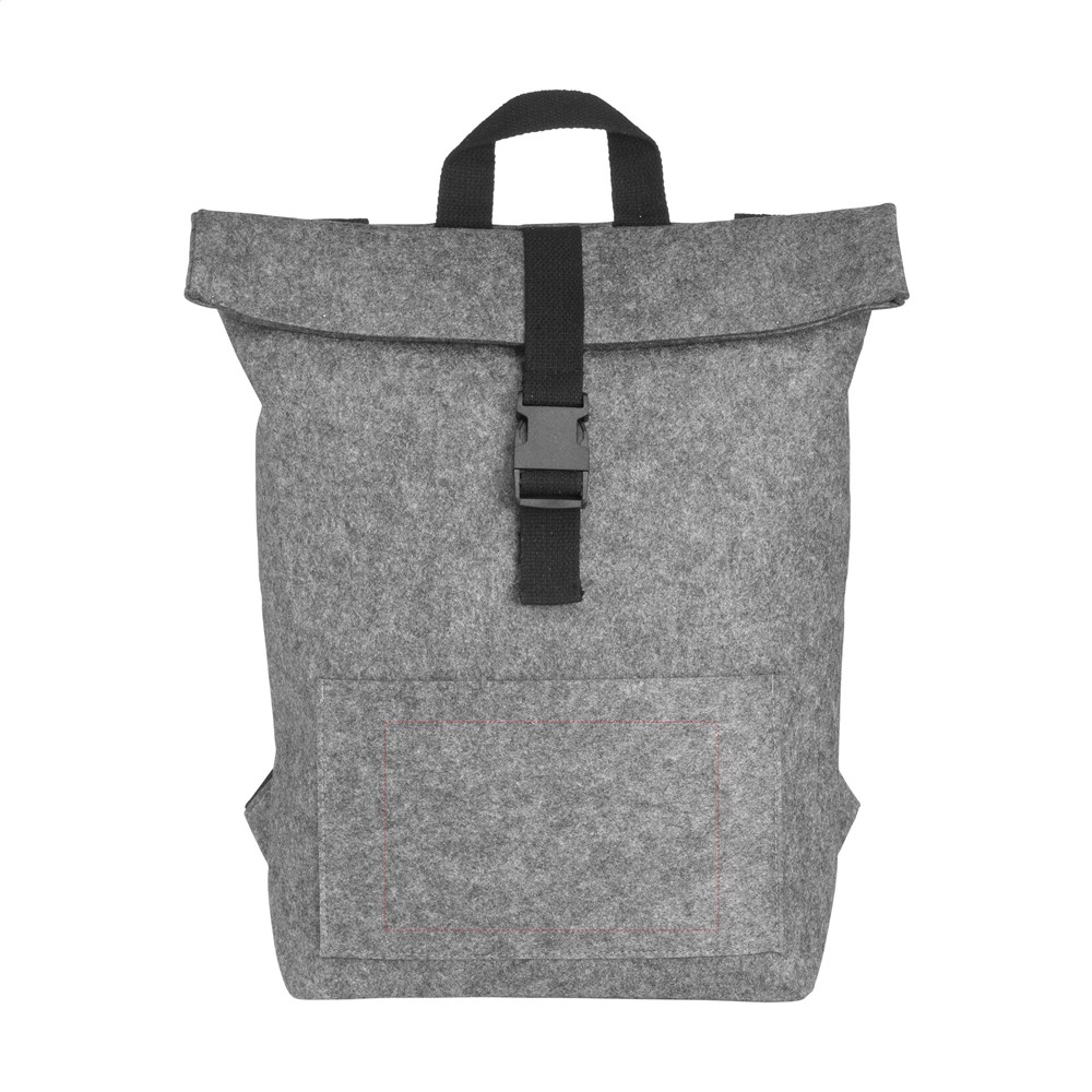 Rugged, practical urban ‘roll-top’ backpack made from sturdy RPET felt. The backpack has a large inner compartment and a pocket on the front. With carrying strap, roll closure and handy click system at the top. GRS-certified. Total recycled material: 80%. Capacity approx. 15 litres.