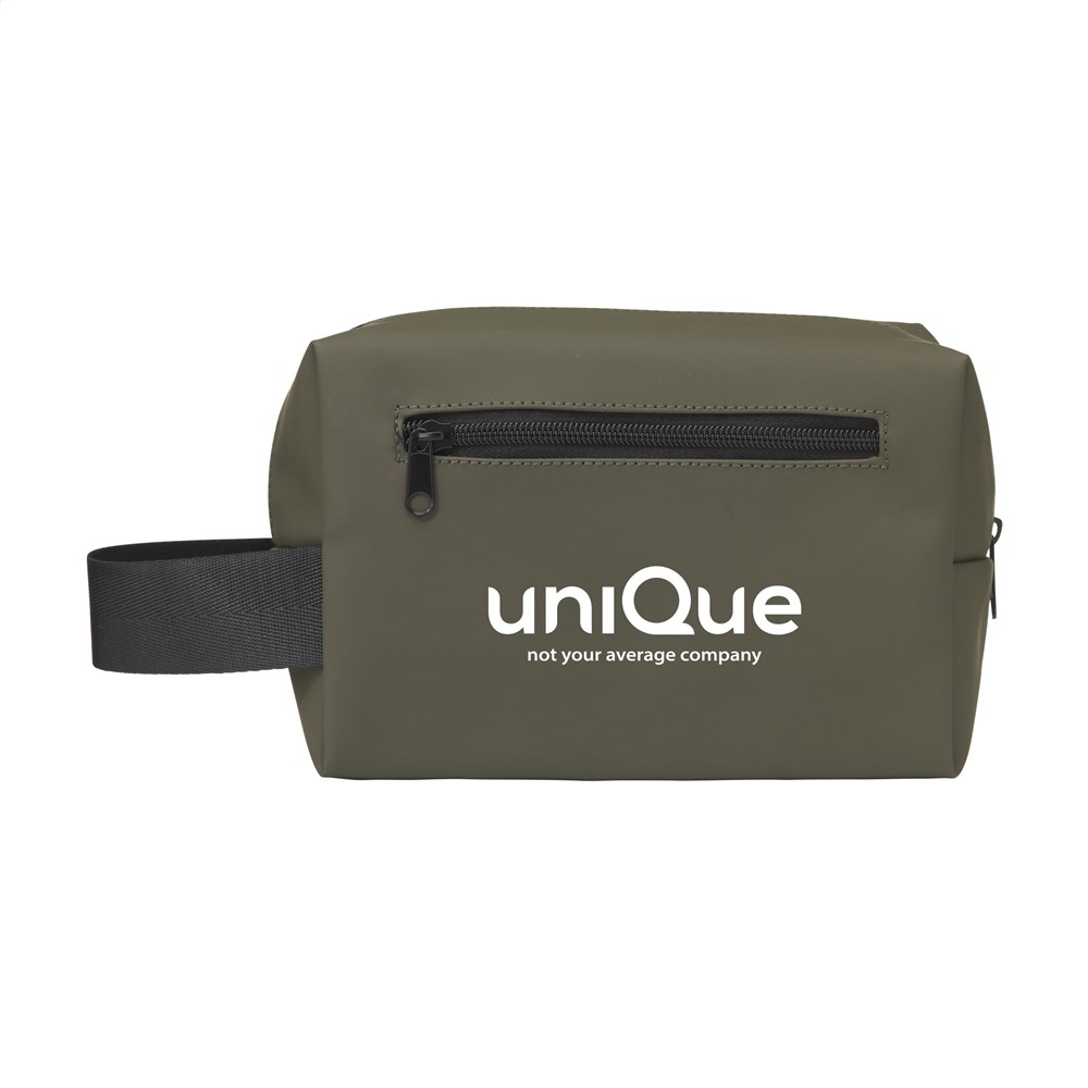Practical and sturdy toiletry bag for the storage of personal care accessories. The outside of the material of this toiletry bag is made from water-repellent PU, 7% recycled PU and 32% recycled polyester. This toiletry bag is very robust but also easy to keep clean. Ideal for use in bathrooms and shower rooms. The inside is finished with a 210D RPET polyester lining. A generously sized zip pocket features elastic straps and a handy side pocket, making it easy to keep all of your essentials organised. In addition, this toiletry bag has a second zipper pocket on the front and a handy carrying loop. A sturdy all-rounder for daily use. RCS-certified. Total recycled material: 39%.