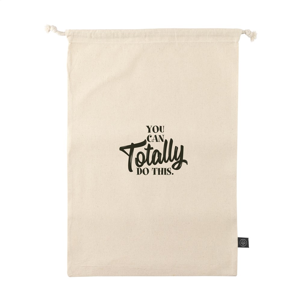 Gift pouch made from 100% recycled cotton (150 g/m²). With drawstrings made from recycled polyester and recycled cotton. Original as gift packaging and suitable for storing items. GRS-certified. Capacity approx. 4 litres.