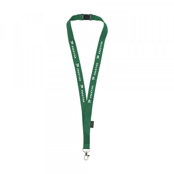 Lanyard made from RPET: recycled PET bottles. With metal carabiner and safety clip. GRS-certified. Total recycled material: 58%.