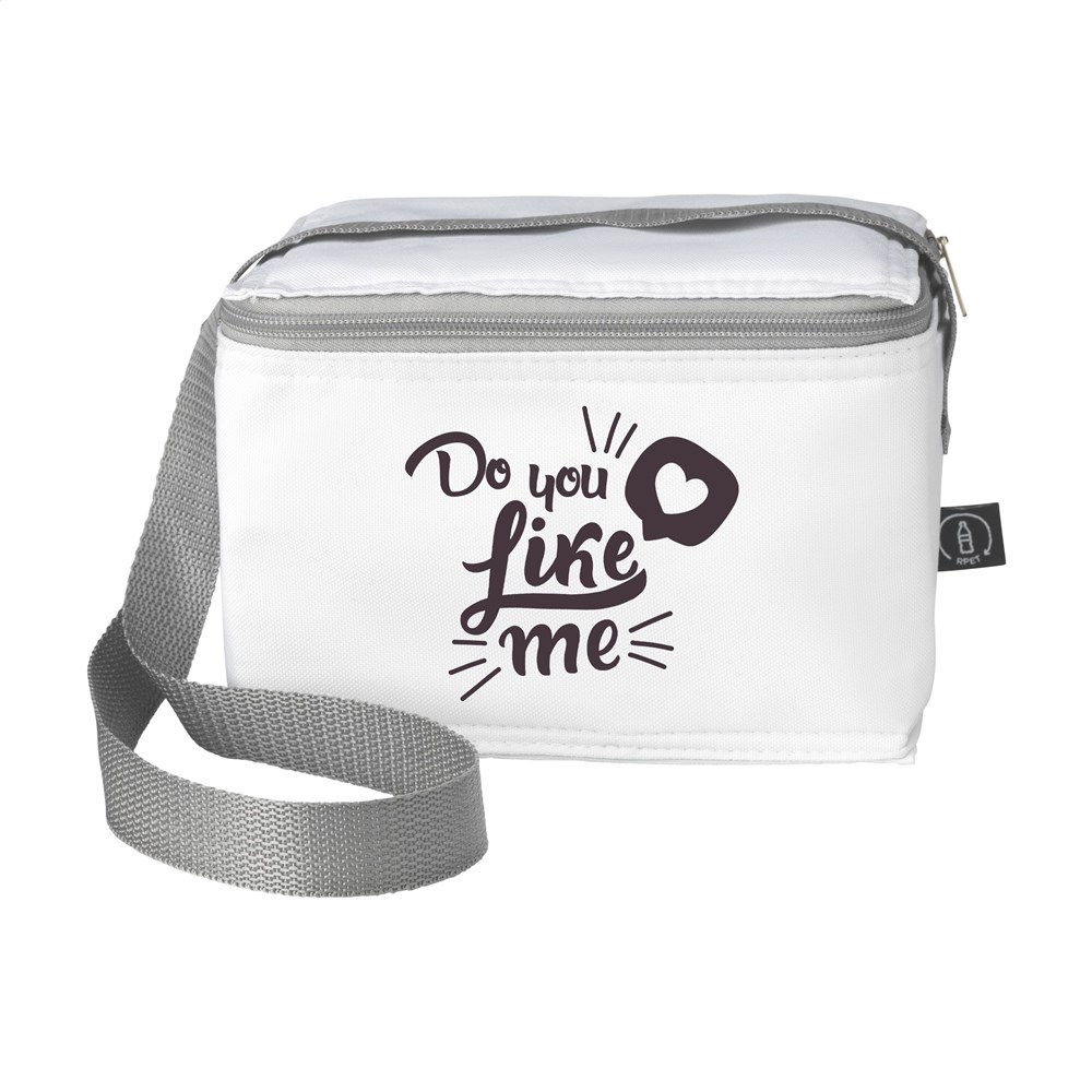 Cooler bag made from 600D RPET polyester. Ideal for a 6-pack of drinks cans. With a carry-strap. GRS-certified. Total recycled material: 51%. Capacity approx. 3 litres.