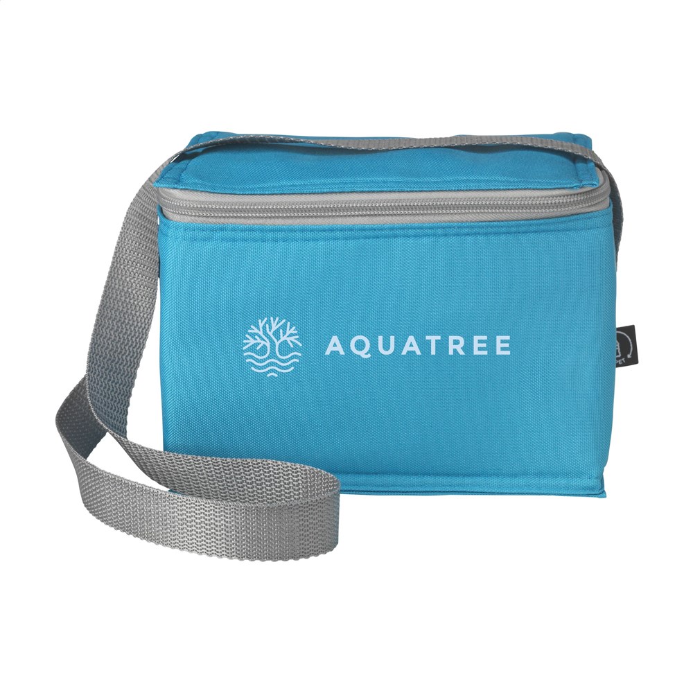 Cooler bag made from 600D RPET polyester. Ideal for a 6-pack of drinks cans. With a carry-strap. GRS-certified. Total recycled material: 51%. Capacity approx. 3 litres.