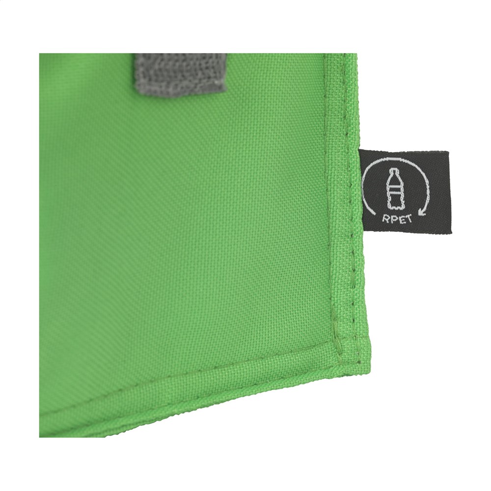 Cooler bag made from 600D RPET polyester. Ideal for a 6-pack of drinks cans. With a carry-strap. GRS-certified. Total recycled material: 51%. Capacity approx. 3 litres.