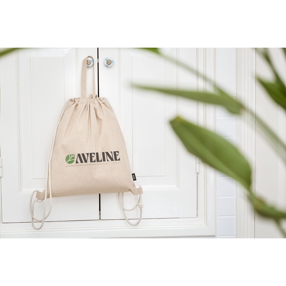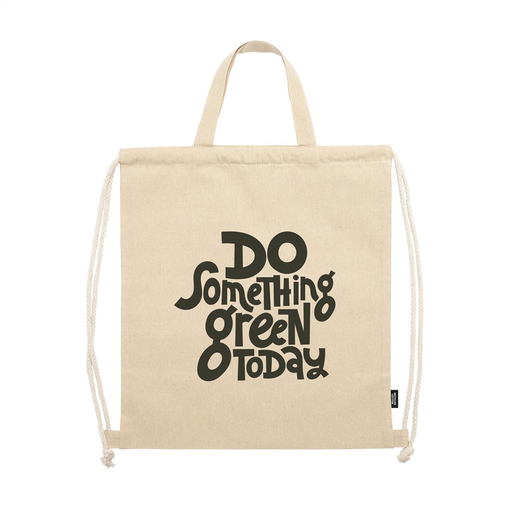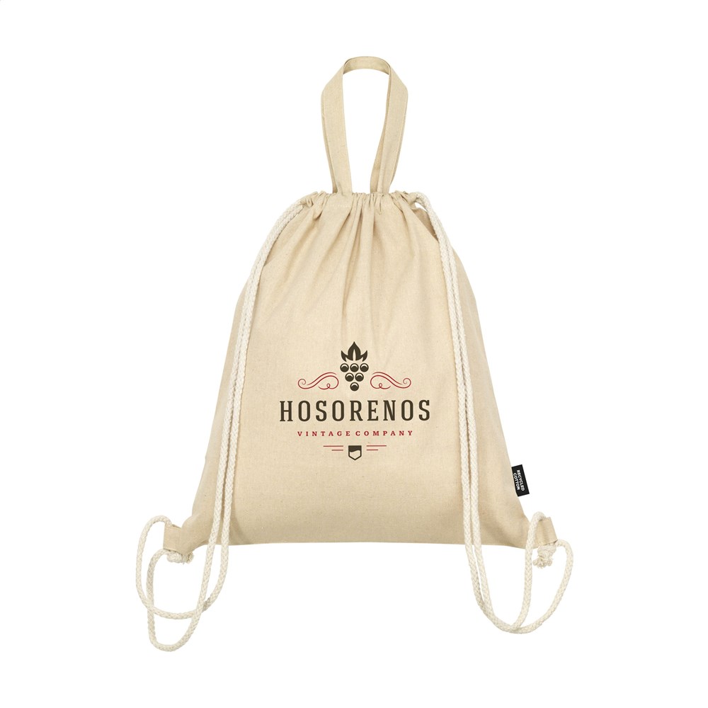 Backpack made from 80% recycled, melange cotton and 20% recycled polyester (180 g/m²). With drawstrings and handles. GRS-certified. Total recycled material: 100%. Capacity approx. 8 litres. This cotton is recycled. As a result, the colour may vary per product.