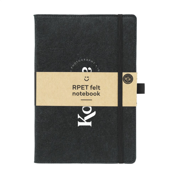 A5 notebook with removable cover made from GRS-certified RPET felt. The beautiful cover has a handy pen loop and a closing elastic. The notebook has approx. 80 sheets/160 pages of white, lined, recycled GRS-certified paper (80 g/m²). ) and a bound spine. GRS-certified. Total recycled material: 98%. Each item supplied with an individual kraft sleeve.