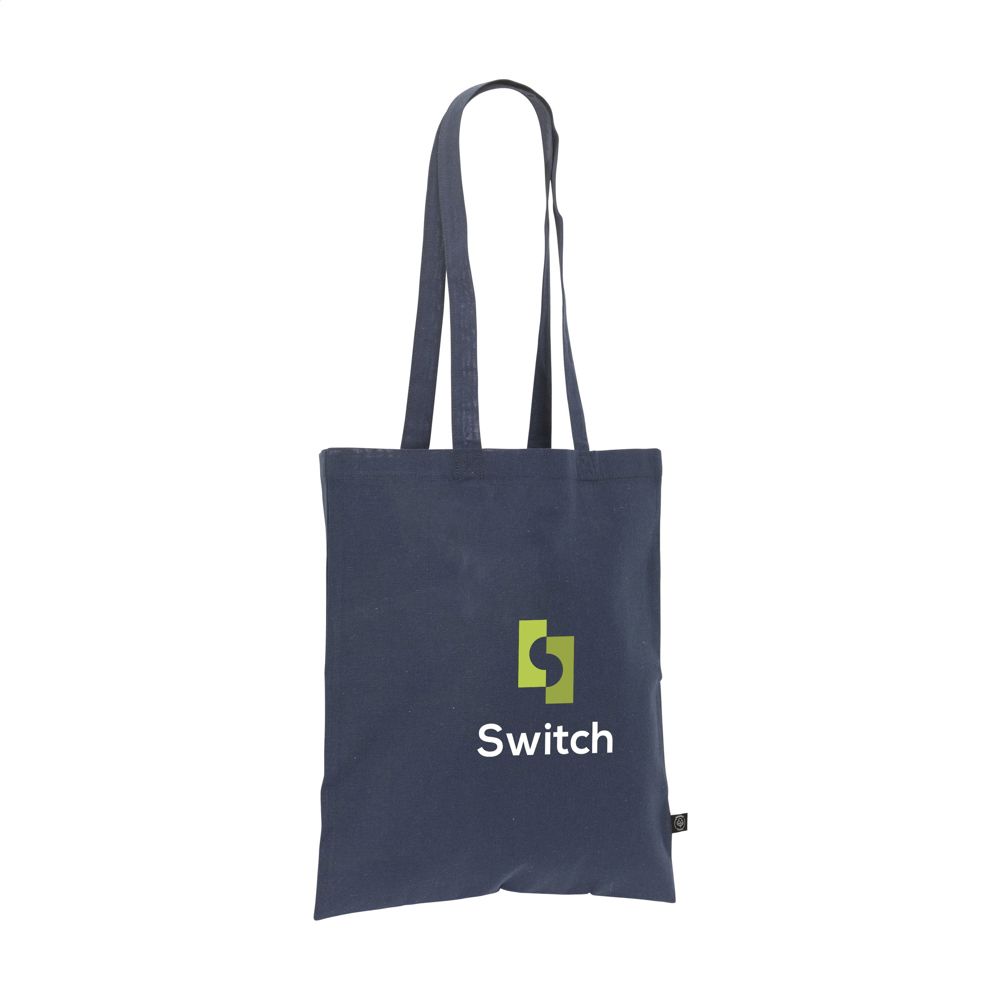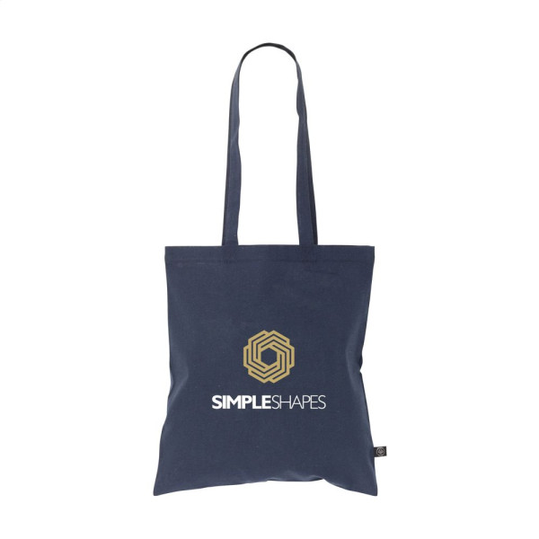 Shopping bag with long handles made from 80% recycled cotton and 20% recycled polyester (150 g/m²). GRS-certified. Total recycled material: 100%. Capacity approx. 8 litres.