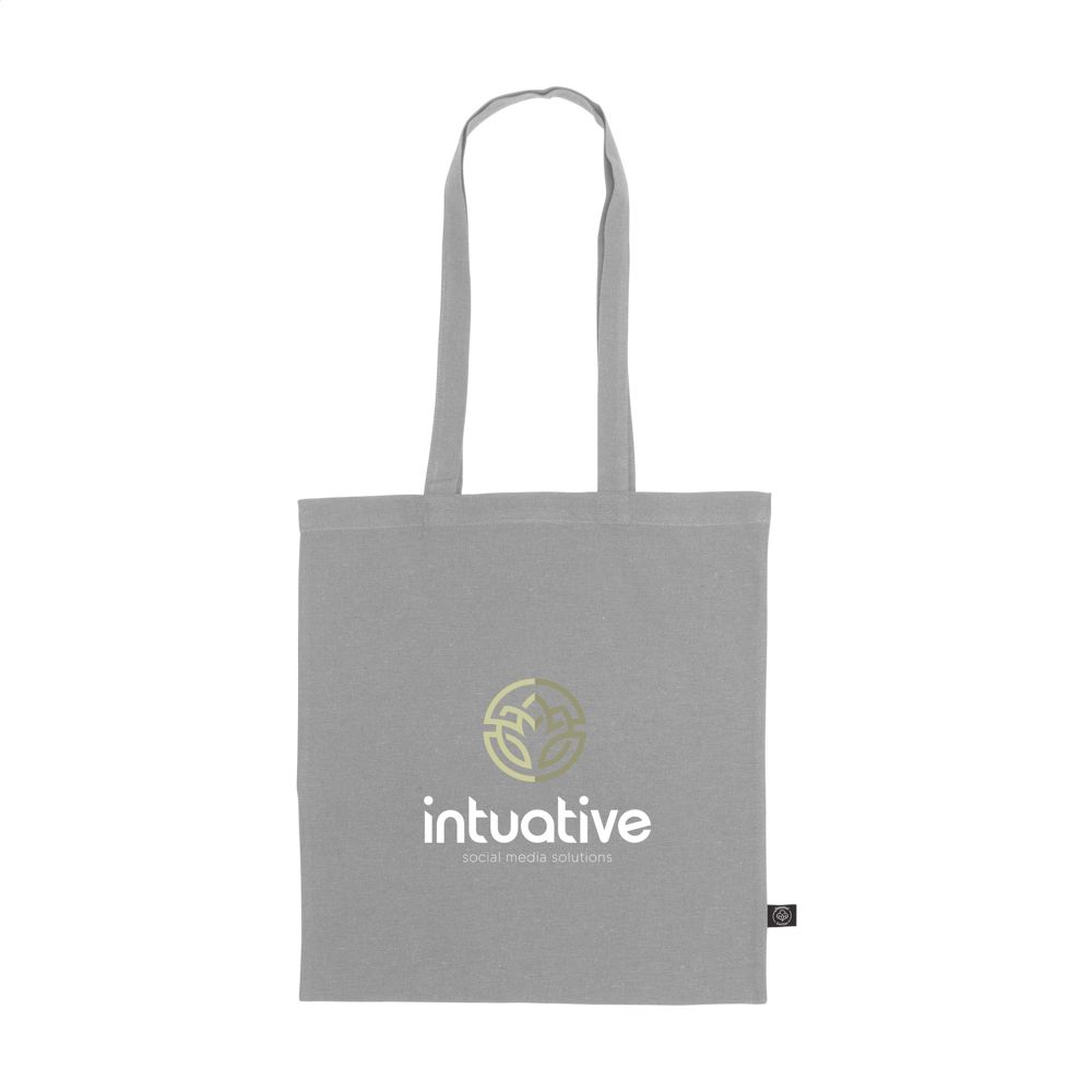 Shopping bag with long handles made from 80% recycled cotton and 20% recycled polyester (150 g/m²). GRS-certified. Total recycled material: 100%. Capacity approx. 8 litres.