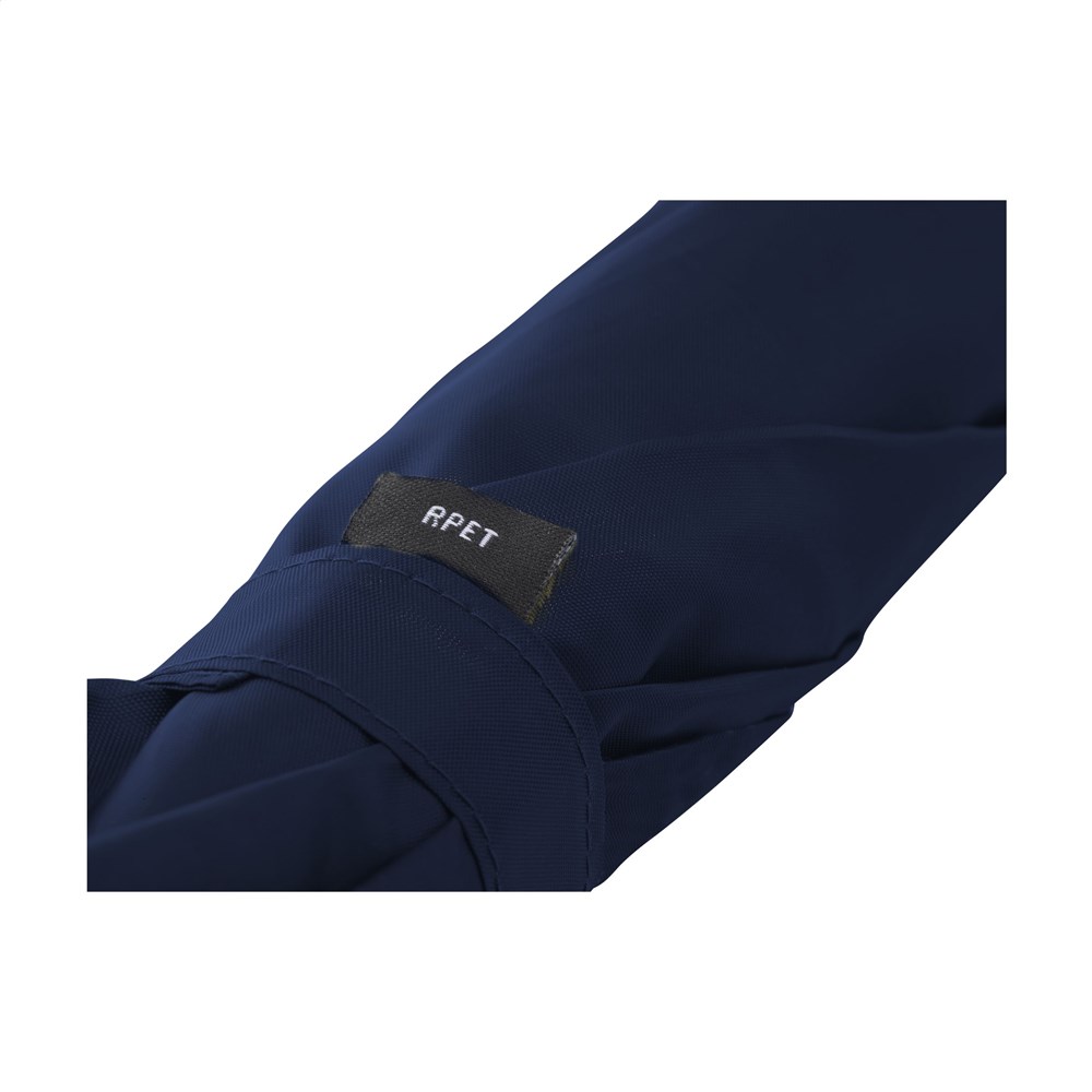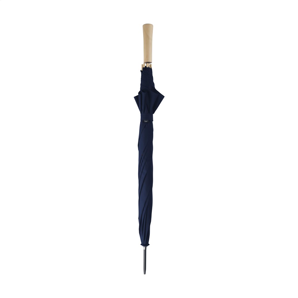 Umbrella supplied with RPET 190T pongee polyester cover. This umbrella has a metal shaft and a fiberglass frame, a wooden handle and Velcro closure. RCS-certified. Total recycled material: 16%.