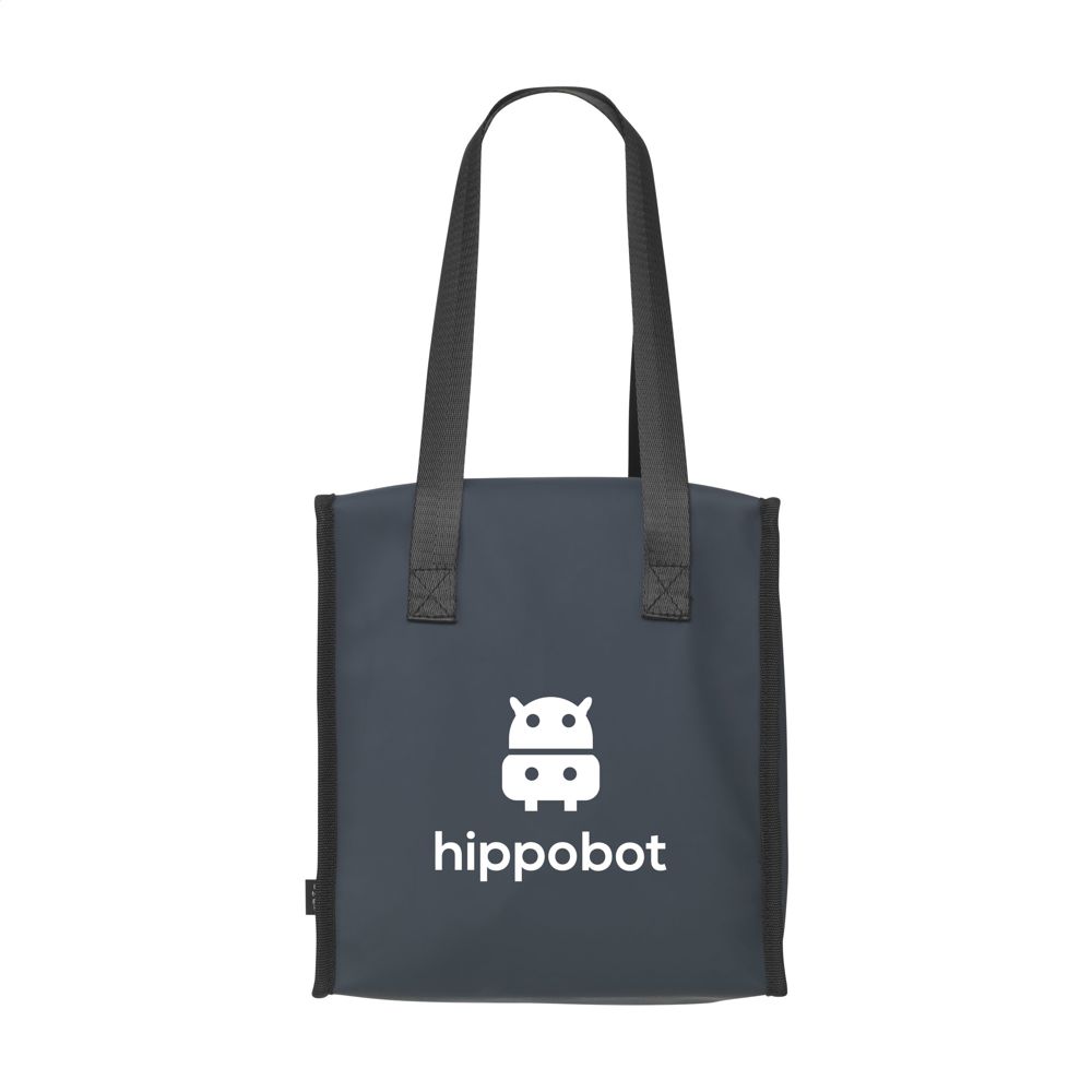 Sturdy cool bag made from water-repellent PU, 7% recycled PU and 15% recycled polyester. This bag is extremely hard-wearing and is also easy to keep clean. The inside is lined with aluminium foil to keep any contents cool. This cooler bag features a zip and two sturdy handles. There is an extra storage compartment on the front - useful for your phone, wallet or anything else that does not need to be kept cool. RCS-certified. Total recycled material: 22%. Capacity approx. 9 litres.