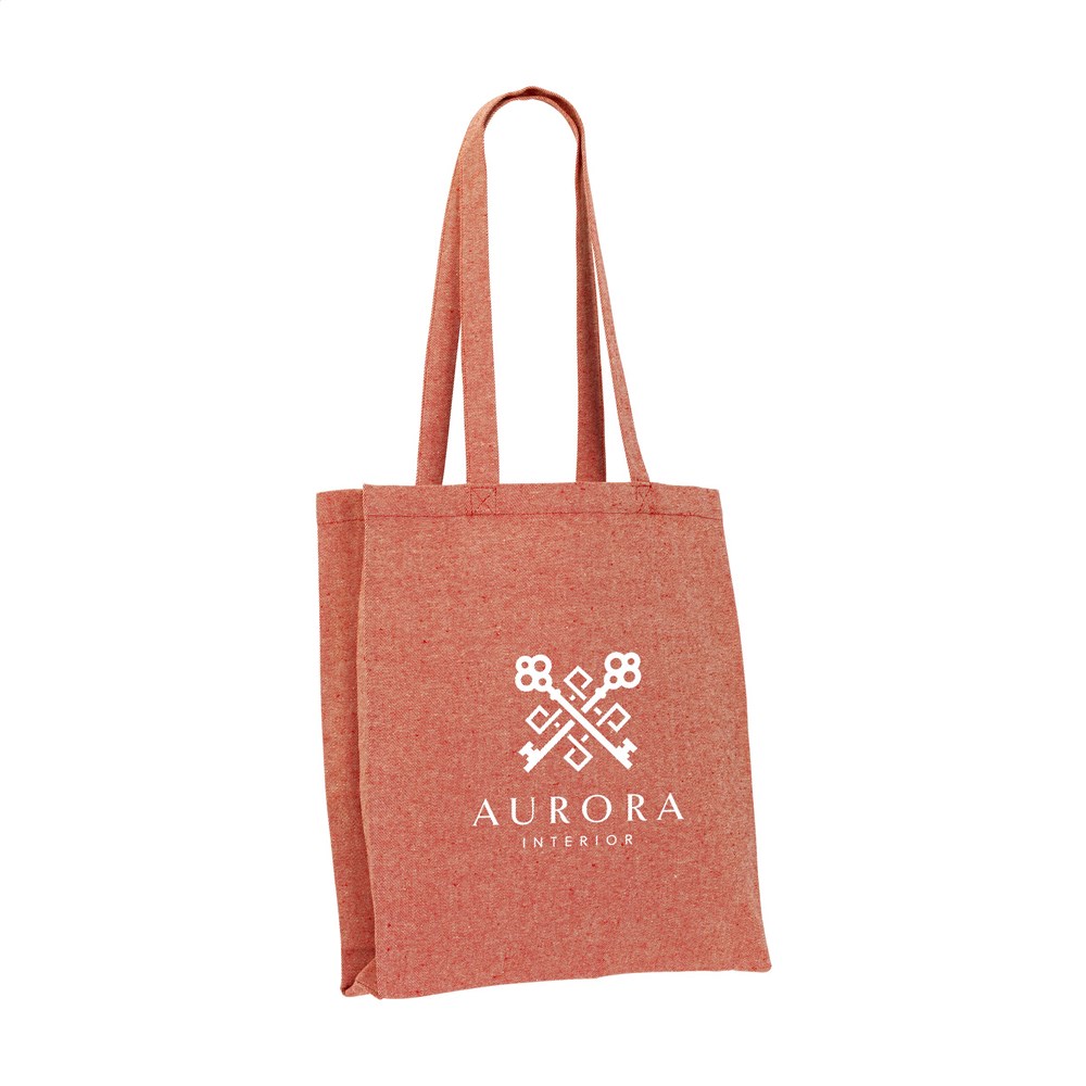 Shopping bag with long handles, made from 80% recycled, melange cotton canvas and 20% recycled polyester (280 g/m²). GRS-certified. Total recycled material: 100%. Capacity approx. 12 litres. This cotton is recycled. As a result, the colour may vary per product.