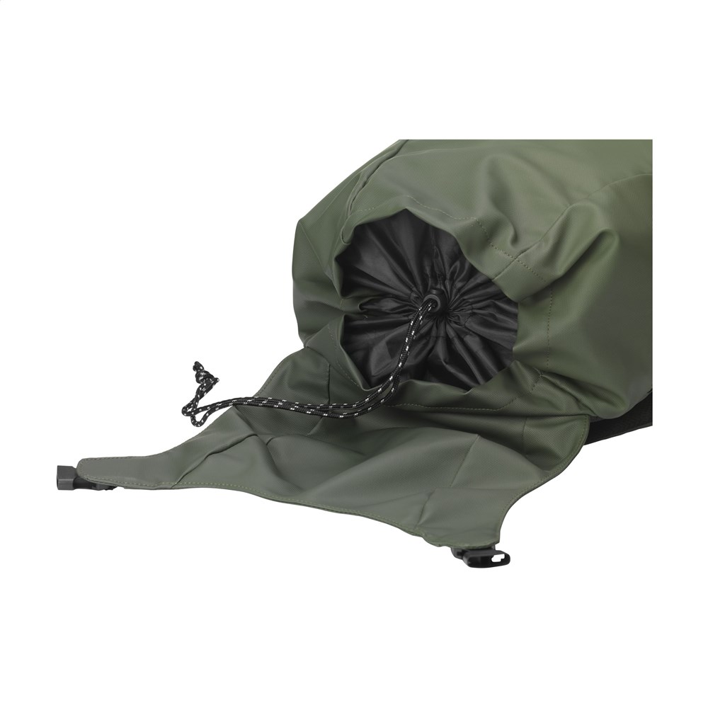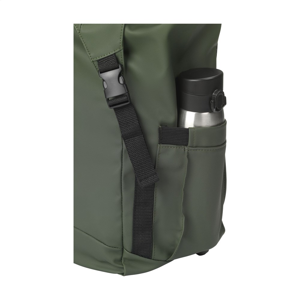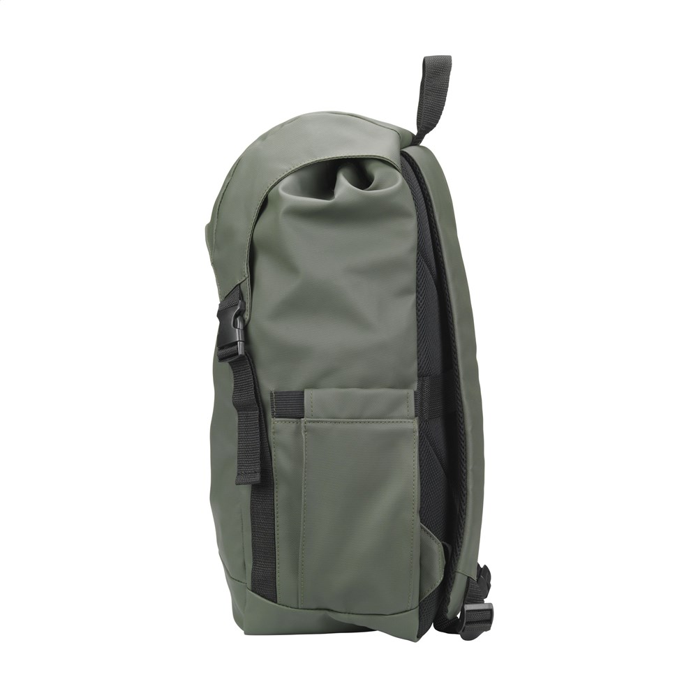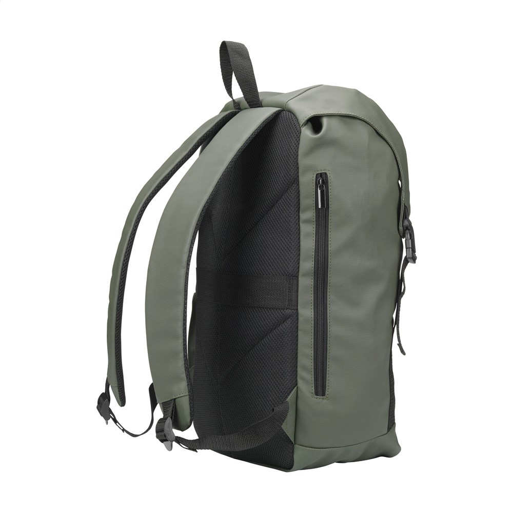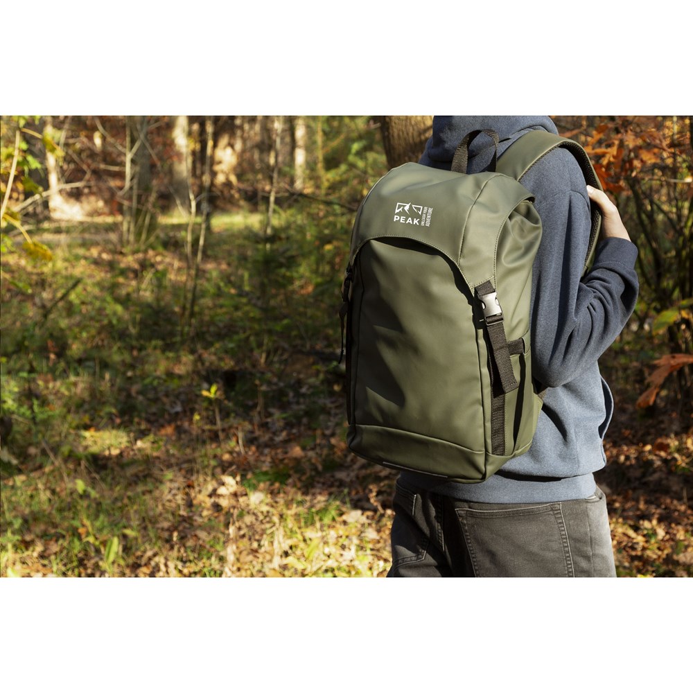 Very spacious backpack made from water-repellent, 100% recycled polyester. This backpack features a very spacious main compartment with a separate laptop compartment (up to 15.6 inches), an extra zip pocket on the side and a pocket for a drinking bottle. The adjustable shoulder straps and back have breathable mesh and foam for extra carrying comfort. Neatly finished and lined with 100% recycled 210D polyester. Fitted with a drawstring closure and flap with snap fasteners and a reflective accent for visibility in the dark. Perfect as a sports bag, with plenty of space for clothes and shoes but also ideal as a travel bag or school bag. GRS-certified. Capacity approx. 20 litres.