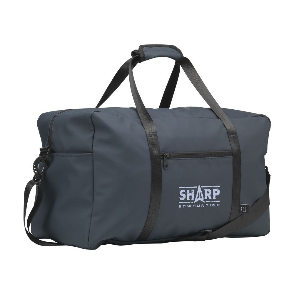 Very spacious sports/travel bag with 2 zip pockets on the inside and additional pockets on the exterior. With extra storage compartments, handles and an adjustable, detachable shoulder strap. This bag is made from water-repellent PU, 7% recycled PU and 25% recycled polyester. Neatly finished with an RPET lining. This versatile bag is hard-wearing and is also easy to keep clean. Suitable as a sports bag, weekend bag and travel bag. RCS-certified. Total recycled material: 32%. Capacity approx. 35 litres.