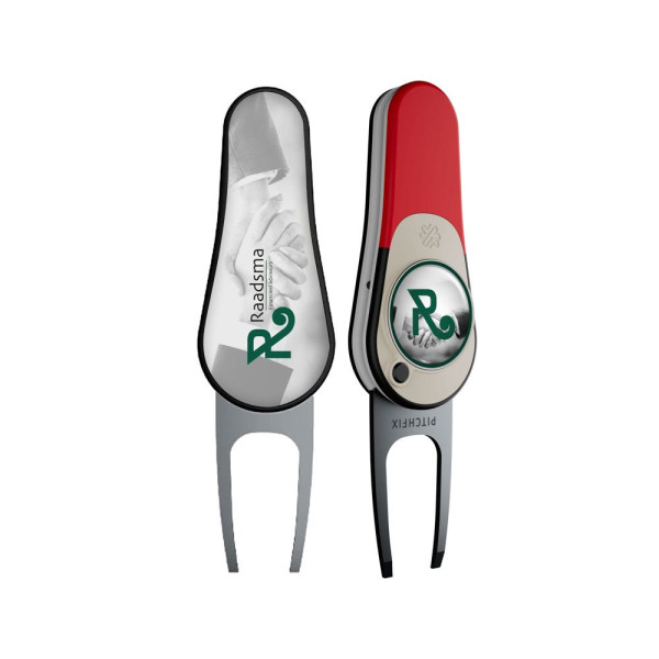 Lightweight, automatic fold-in pitchfork made of high quality ABS plastic, equipped with a magnetic ball marker with doming and a full colour print at the back