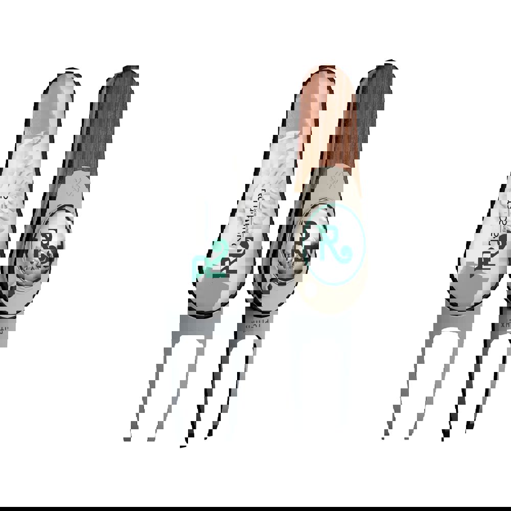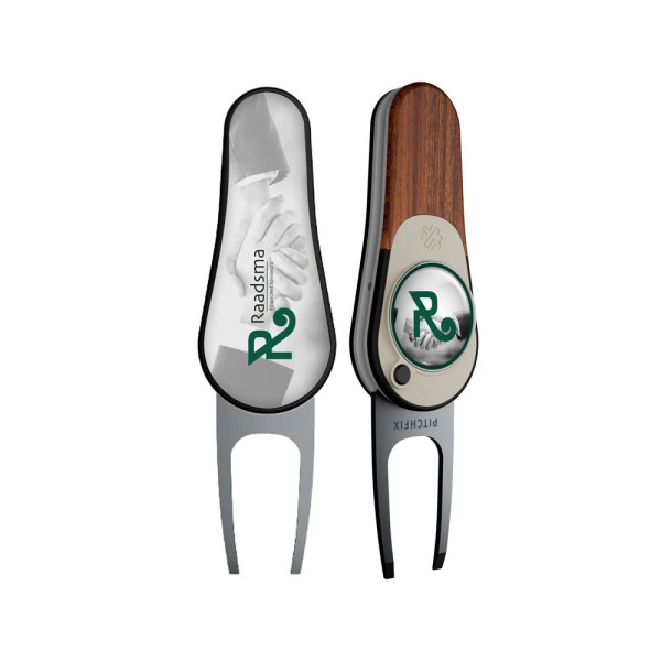 Lightweight, automatic fold-in pitchfork made of high quality ABS plastic, equipped with a magnetic ball marker with doming and a full colour print at the back