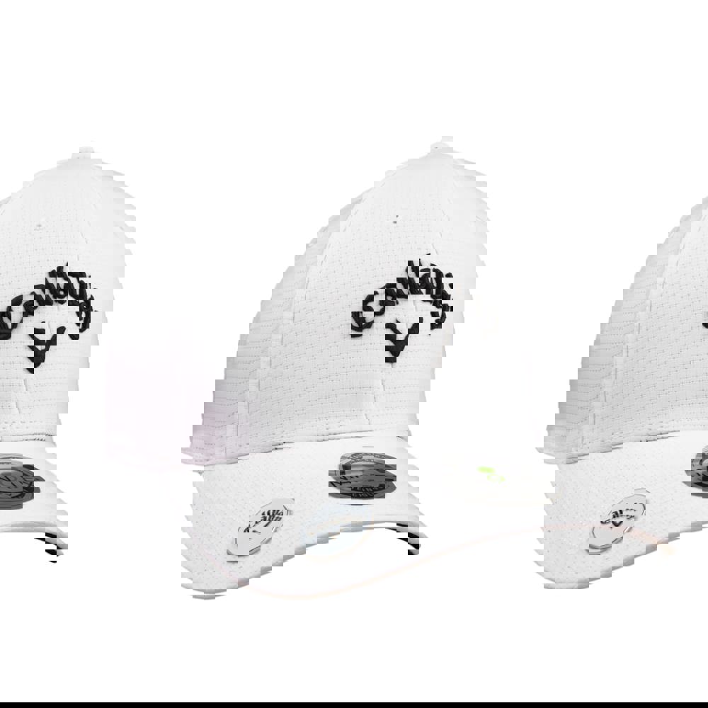 Medium profile cap made of polyester with velcro closure, including a magnetic ball marker on the peak. Callaway logo embroidered on the front and Odyssey logo on the back. Head circumference 58 cm
