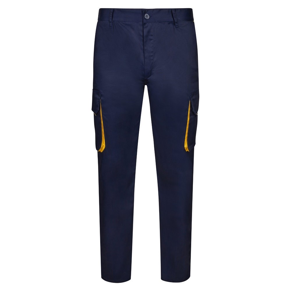 Two-tone multi-pocket twill trousers (200g/m²), in cotton (35%) and polyester (65%). With elasticated waistband and contrasting colour on the gussets, pullers and stitching. Contains six pockets: (2 French pockets, 2 side gusset pockets and 2 back gusset pockets). Size: 34, 36, 38, 40, 42, 44, 46, 48, 50, 52, 54, 56, 58, 60