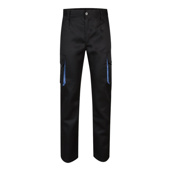 Two-tone multi-pocket twill trousers (200g/m²), in cotton (35%) and polyester (65%). With elasticated waistband and contrasting colour on the gussets, pullers and stitching. Contains six pockets: (2 French pockets, 2 side gusset pockets and 2 back gusset pockets). Size: 34, 36, 38, 40, 42, 44, 46, 48, 50, 52, 54, 56, 58, 60