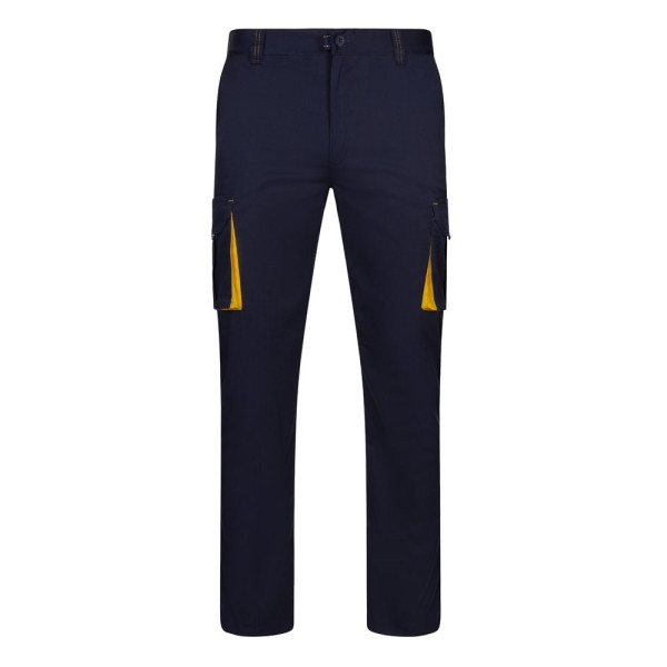 Two-tone, multi-pocket stretch trousers (240g/m²), in cotton (46%), EME (38%) and polyester (16%). Slim Fit, elasticated waistband and contrasting colour on the gussets, pullers and stitching. Contains six pockets (2 French pockets, 2 side gusset pockets and 2 back gusset pockets). Size: 34, 36, 38, 40, 42, 44, 46, 48, 50, 52, 54, 56, 58, 60