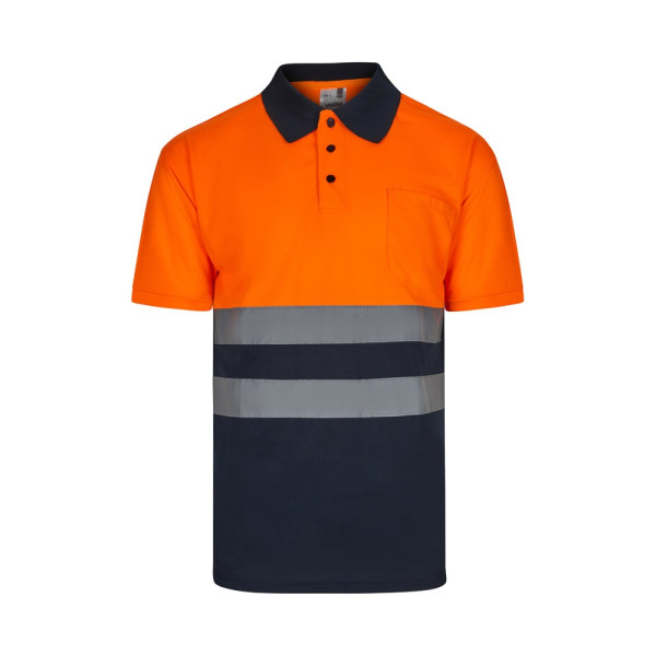 Short-sleeved bird-eye polo shirt (140g/m²) in polyester (100%). Contrasting buttons and ribbed collar. Reflective stripes on the chest and one chest pocket. Product in compliance with EU Reg. 2016/425, certified by EN20471 and class Nº 1. Size: S, M, L, XL, 2XL, 3XL