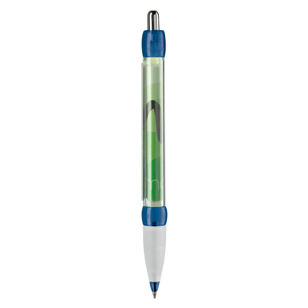 Transparent ball pen with rubber grip. Full-colour printing on both sides of the banner, X20 standard: blue ink. Also possible with imprint on the body or clip. Delivery time is approximately six weeks.