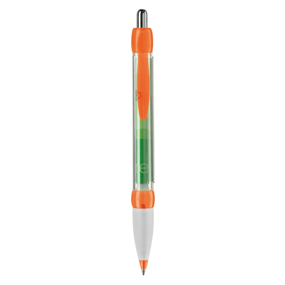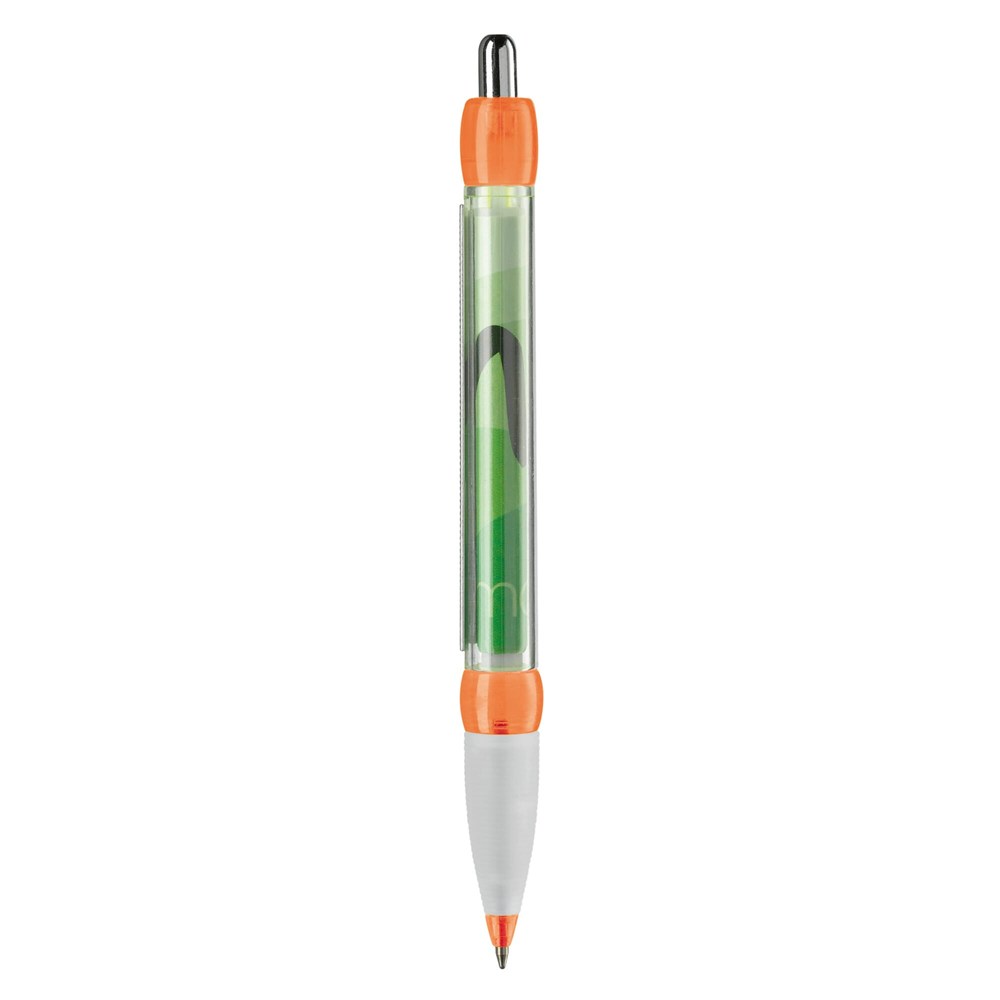 Transparent ball pen with rubber grip. Full-colour printing on both sides of the banner, X20 standard: blue ink. Also possible with imprint on the body or clip. Delivery time is approximately six weeks.
