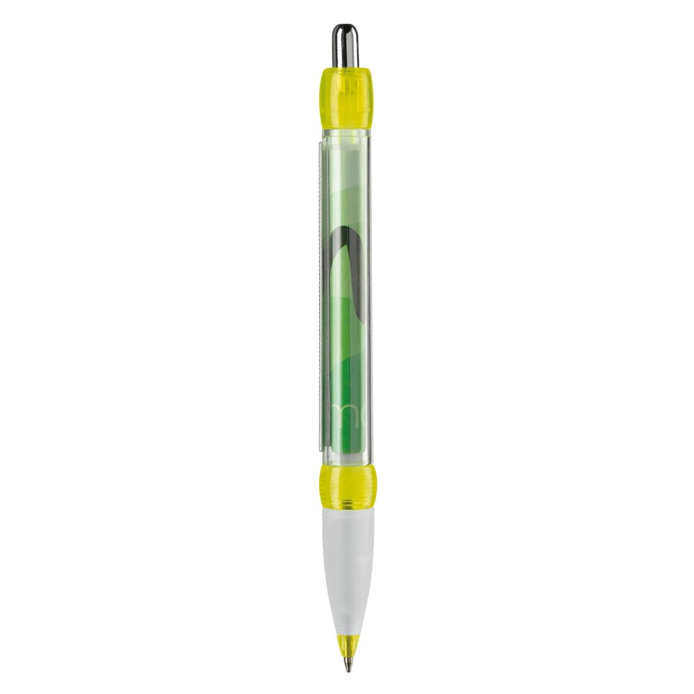 Transparent ball pen with rubber grip. Full-colour printing on both sides of the banner, X20 standard: blue ink. Also possible with imprint on the body or clip. Delivery time is approximately six weeks.