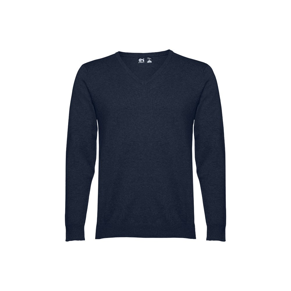Pullover with "V" neckline for men 70% cotton and 30% polyamide (220 g/m²). Features a collar, cuffs and lower part in rib and inset sleeves Sizes: S, M, L, XL, XXL