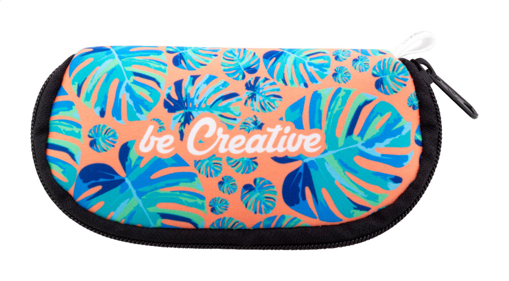 Custom made, RPET neoprene sunglasses case with zipped compartment. With all over sublimation printed graphics and distinctive RPET label. Price includes sublimation printing. MOQ: 50 pcs.