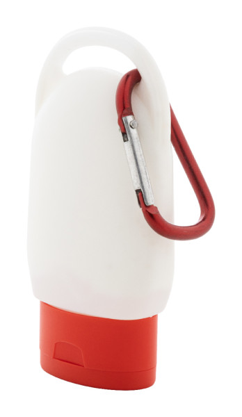Sunscreen lotion in plastic container with matching colour cap and carabiner. SPF30 protection, 30 ml.