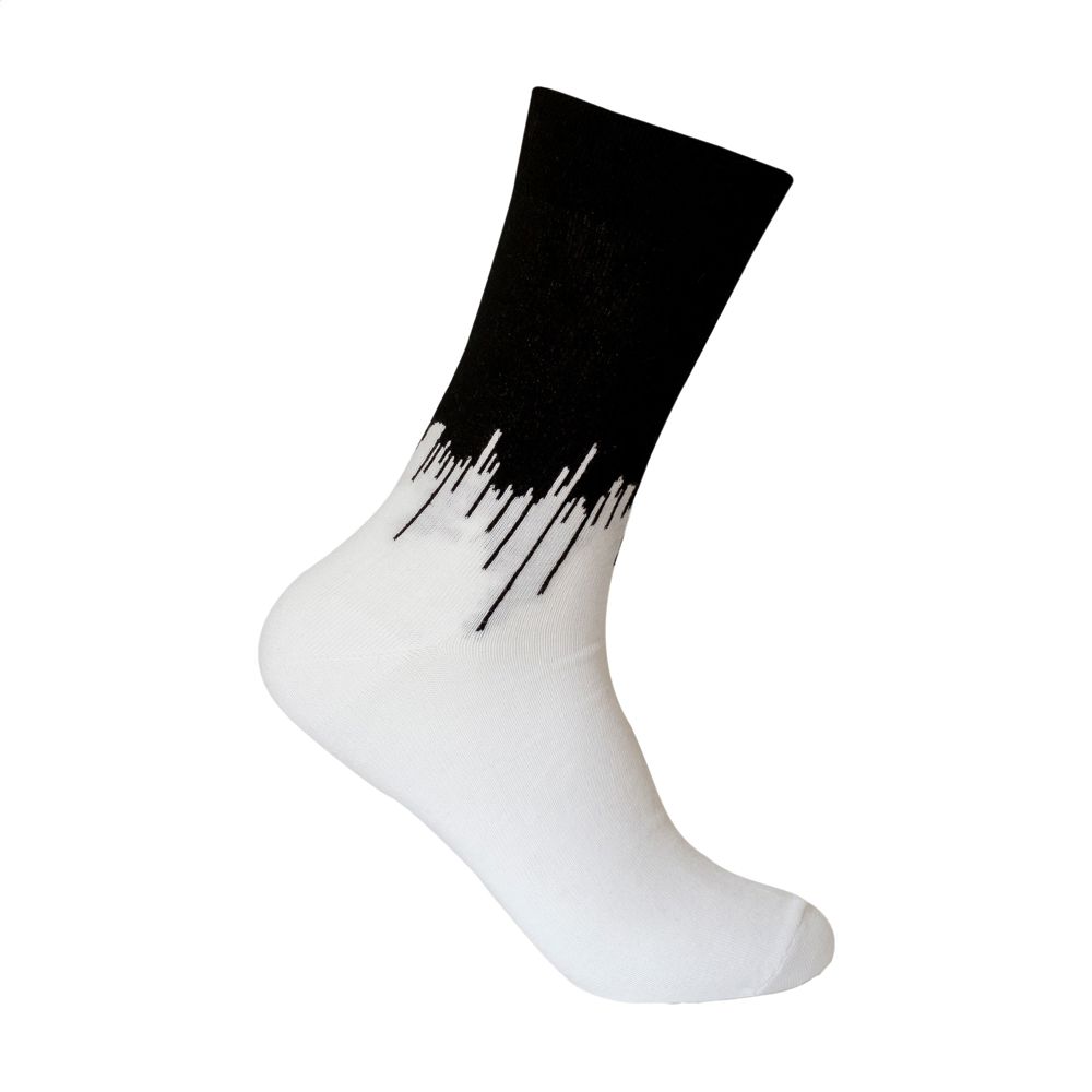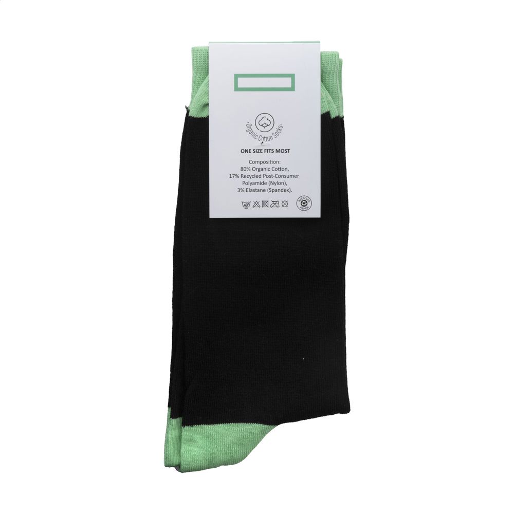 Comfortable socks from the Kingly brand. These durable, high-quality socks are made from premium upcycled yarn sourced from textile waste materials and consist of a blend of 85% upcycled cotton, 12% regenerated polyamide from post-consumer material and 3% elastane. They have a snug, comfortable fit and reinforced heel and toe areas for a longer life. The socks can be personalised with a knitted, customised design in up to 6 colours. Choose from 6 yarn colours of upcycled cotton and 50 colours of regenerated polyamide. Each pair is packed with a recycled label that can be printed with your own full-colour design - creating socks that perfectly match your brand identity. Available sizes: M (36-39) and L (40-46). Minimum order quantity: 50 pairs per size and per design. OEKO-TEX® 24001333 certified and GRS-certified. Made in Europe. EXTRA INFO: The specified PMS colours are approximated as closely as possible with the available yarns. Due to material differences, an exact colour match cannot be guaranteed.