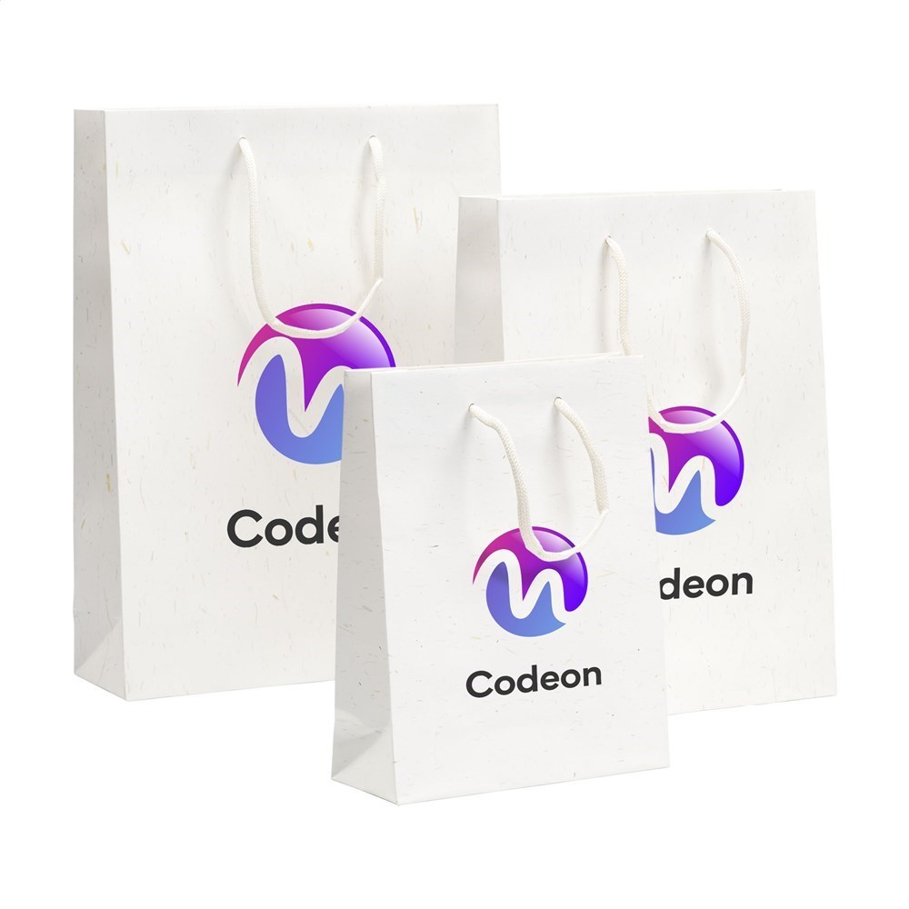 Sturdy paper gift bag (size S) made from recycled paper with straw fibres (180 g/m²). Due to the use of natural fibres, each bag is unique and irregularities in the paper are visible. This gives the product a beautiful natural look. Each bag has two short, paper woven carrying loops, a folded bottom and a side fold. Suitable for all kinds of promotional purposes. No trees are cut down for the production of this bag.