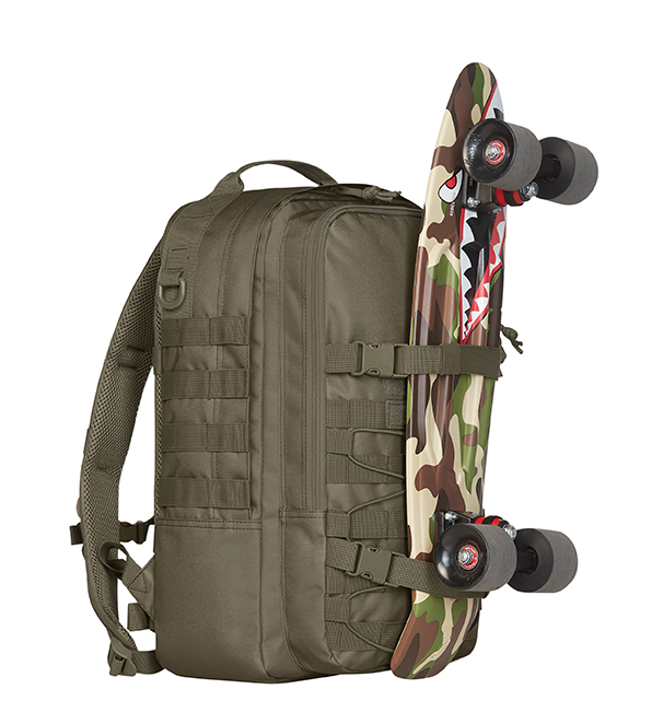 Functional backpack with 3-sided Molle strap system and Velcro trim; elastic cord trim; large main compartment with concealed 2-way zip; padded notebook compartment with Velcro flap; port for cable or drinking tube; large mesh pocket with zipper; front pocket with 2-way zipper and organiser compartments; side compression straps with buckles, can also be closed at the front and back, e.g. for trolley handle attachment; D-rings on the right and left; padded back carrying system with height-adjustable chest strap; D-rings and detachable elastic loops on the straps, length-adjustable waist strap; handle