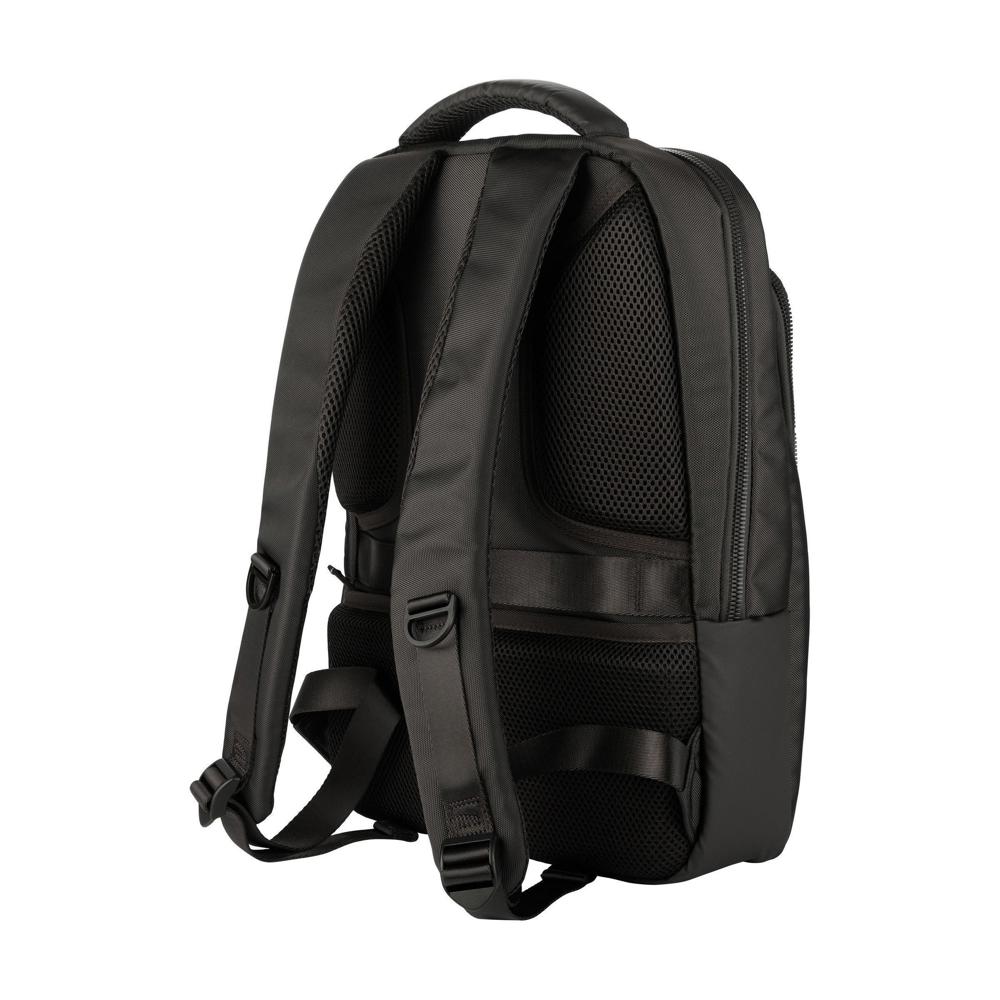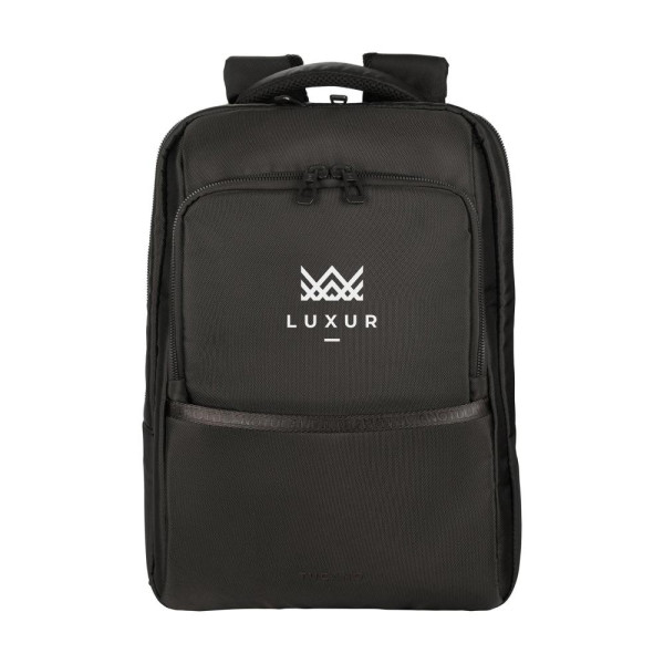 Laptop backpack from Italian brand Tucano. This modern, compact backpack is made with fabric produced from recycled plastic, including 20 recycled PET bottles. The spacious compartment has a mesh zip pocket and a shock-resistant storage compartment for laptops up to 15.6 inches or MacBook Pro 16 inches. The front zip pockets, one of which has two slip pockets, are ideal for storing accessories you want to keep close at hand. There is a hidden zip pocket on the back for safely transporting personal items and travel documents. Fully lined. The adjustable, padded shoulder straps and ergonomic back are equipped with breathable mesh for extra comfort. With a handy trolley strap and striking, high-quality zip fasteners. Capacity approx. 17 litres.