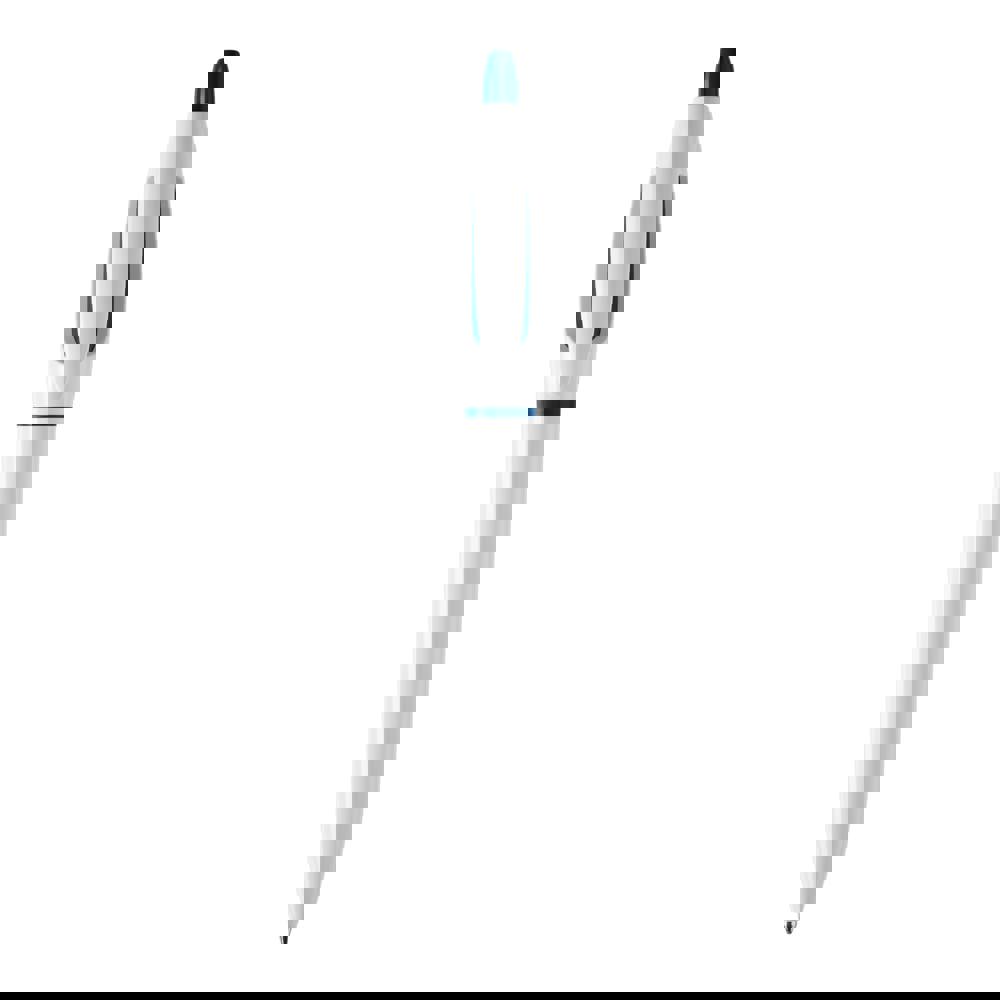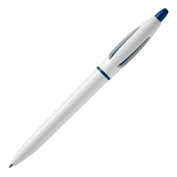 Hardcolour ball pen S! with white barrel and clip. The pusher and ring are coloured. Including a X20 refill with blue writing ink. The pen has a pusher mechanism and is made of ABS, made in Europe. From 5.000 pieces other writing colours possible.