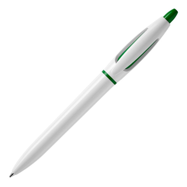 Hardcolour ball pen S! with white barrel and clip. The pusher and ring are coloured. Including a X20 refill with blue writing ink. The pen has a pusher mechanism and is made of ABS, made in Europe. From 5.000 pieces other writing colours possible.