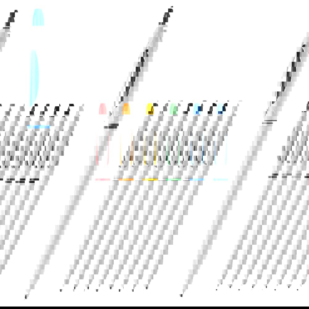 Hardcolour ball pen S! with white barrel and clip. The pusher and ring are coloured. Including a X20 refill with blue writing ink. The pen has a pusher mechanism and is made of ABS, made in Europe. From 5.000 pieces other writing colours possible.