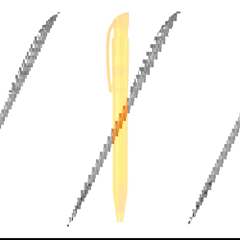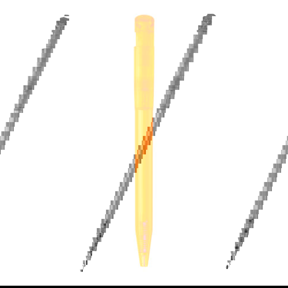 Modern transparent S45 Clear ball pen with bow clip. With a big imprint space, it is a nice advertising item. It includes a pusher mechanism and a X20 refill with blue writing ink. The pen is made of ABS and is made in Europe. From orders of 5.000 pieces, you can choose your own colour combination.