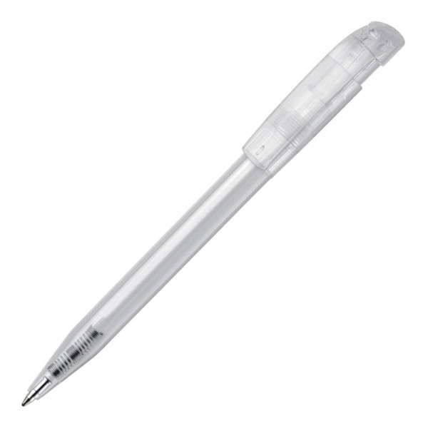 Modern transparent S45 Clear ball pen with bow clip. With a big imprint space, it is a nice advertising item. It includes a pusher mechanism and a X20 refill with blue writing ink. The pen is made of ABS and is made in Europe. From orders of 5.000 pieces, you can choose your own colour combination.